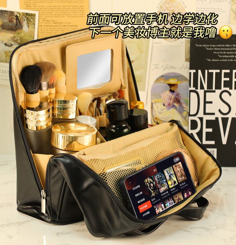 대용량 휴대용 파우치형 PU 수납 가방, 거울 포함, 휴대용 외출용 화장품 가방, 여행 가방에 걸 수 있음스토어 가기