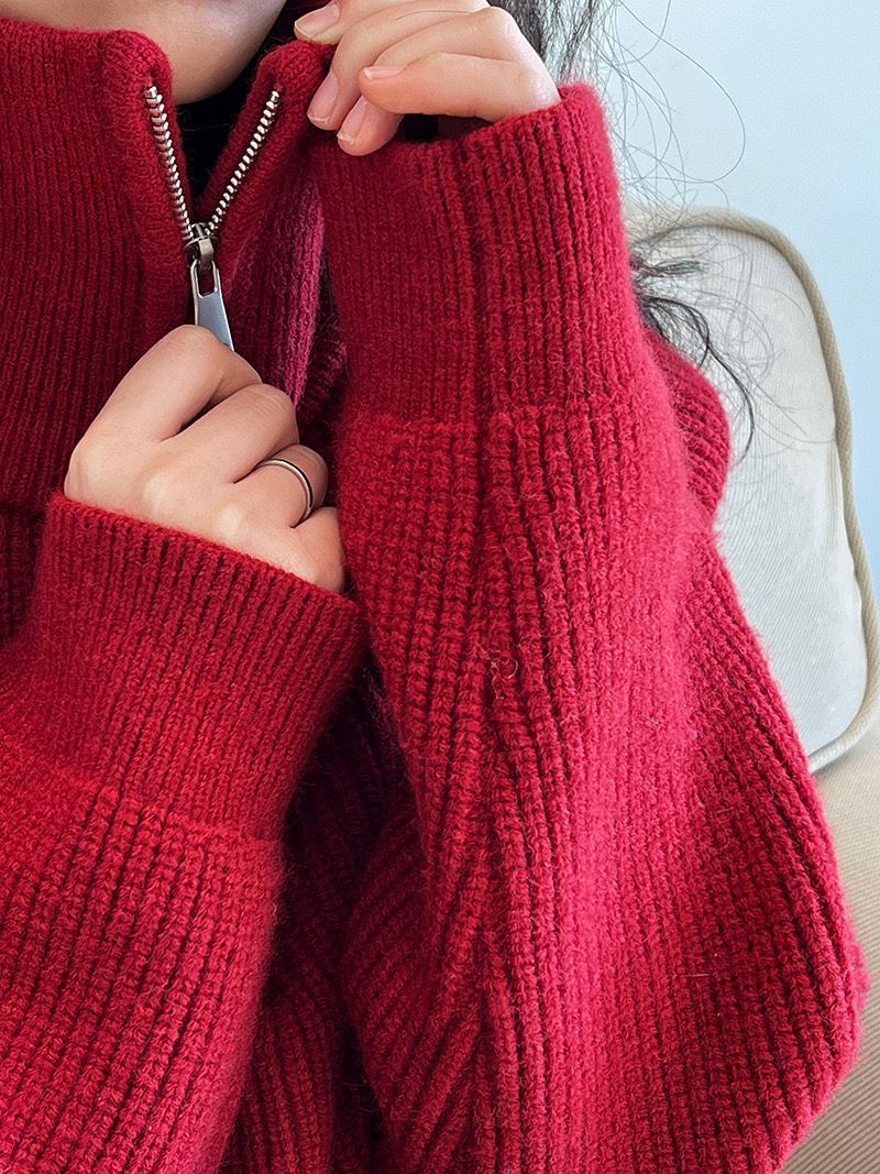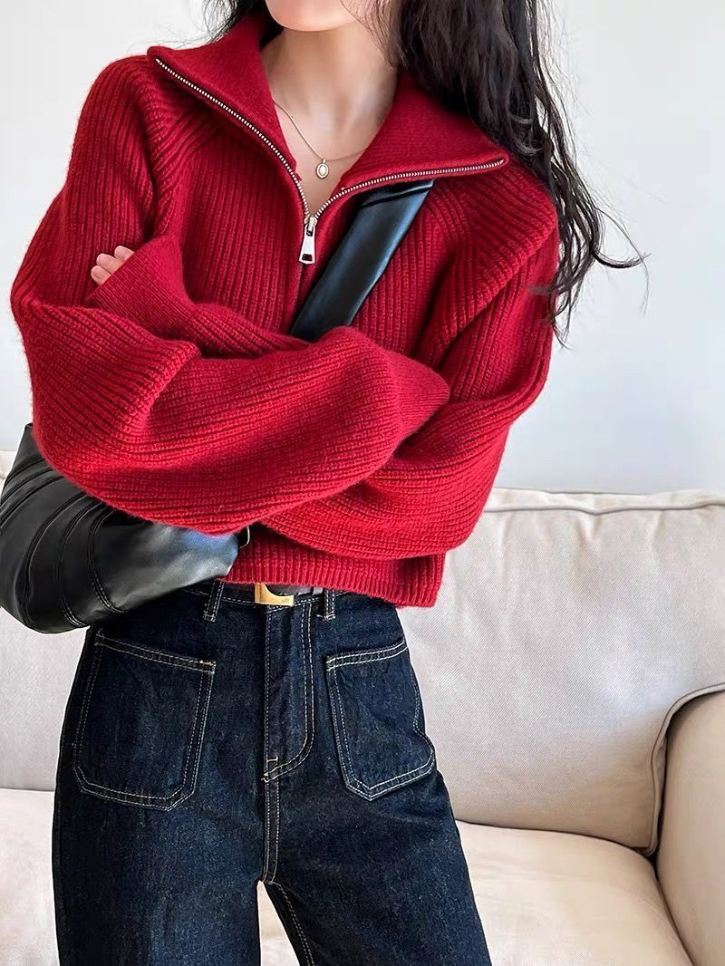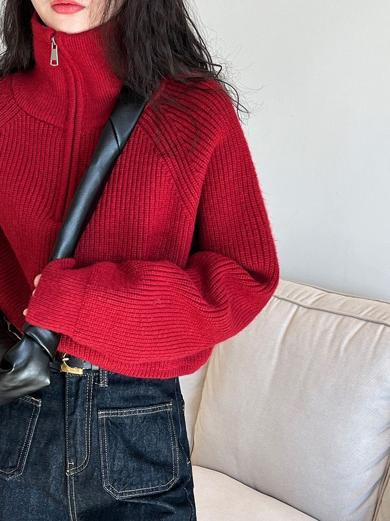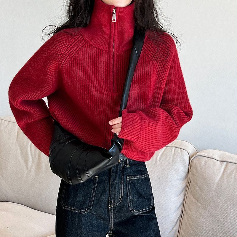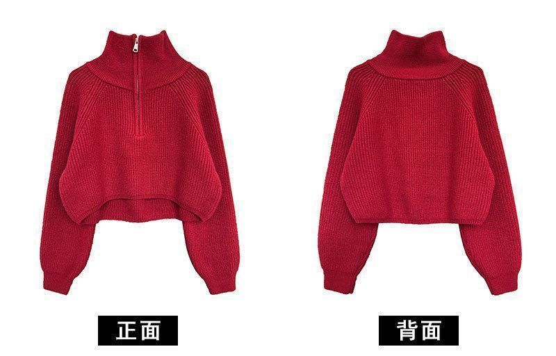 가을 겨울 여성용 짧은 게으른 스타일의 반지퍼 터틀넥 스웨터, 겉옷용 부드럽고 왁시한 루즈 탑, 트렌디함스토어 가기
