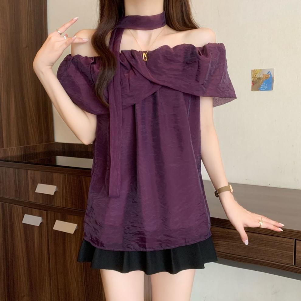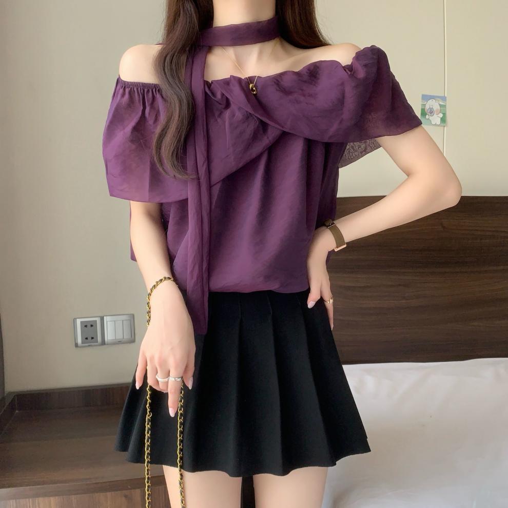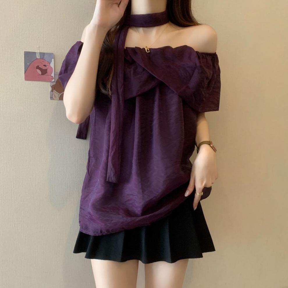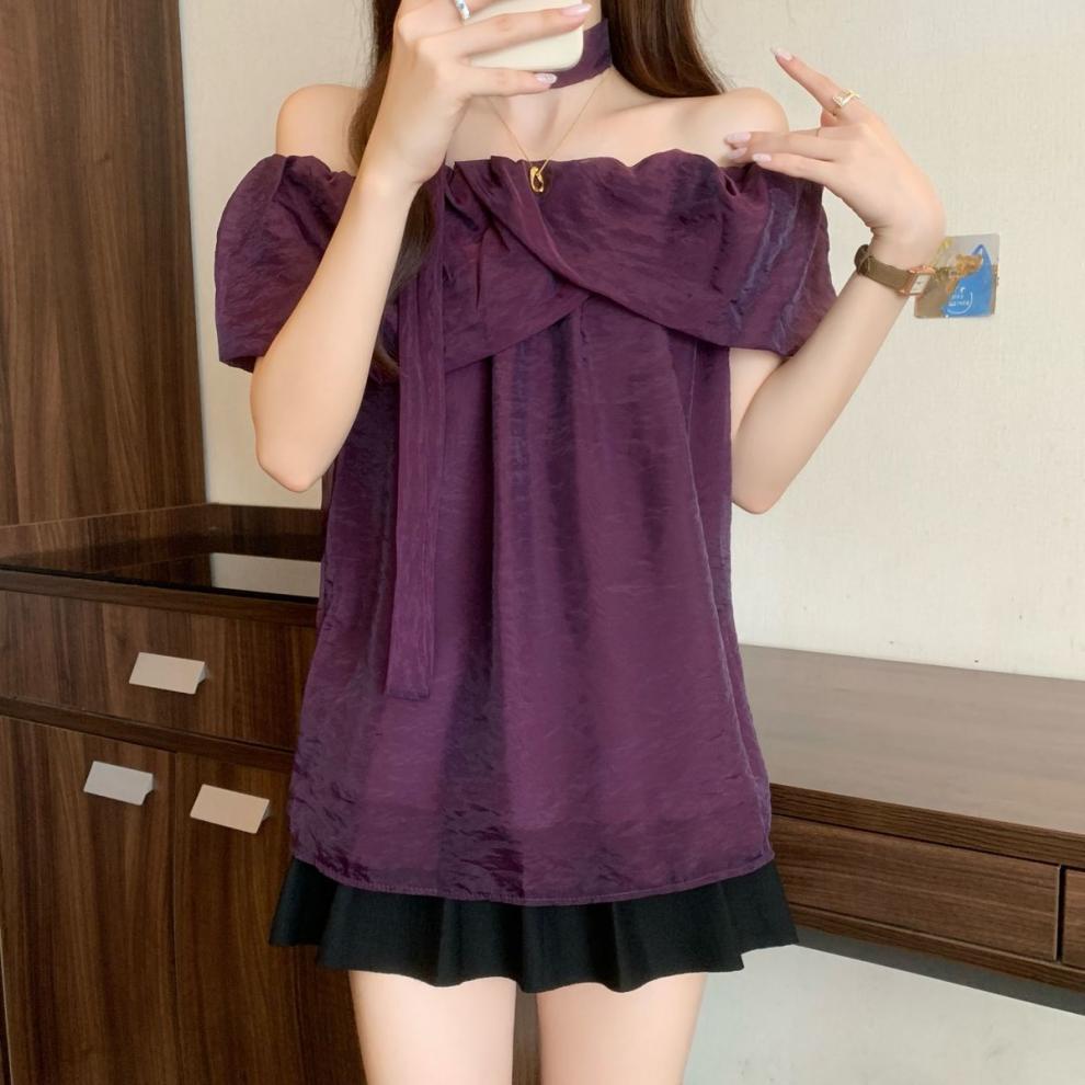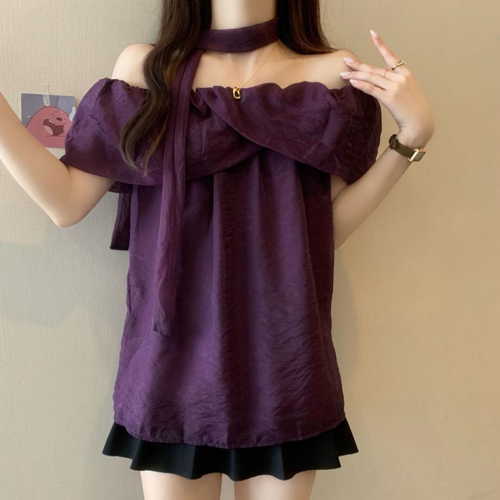 여름용 여성용 프렌치 원 숄더 홀터넥 퍼플 쉬폰 반팔 셔츠 플러스 사이즈 뚱뚱한 mm 차 오프 숄더 탑