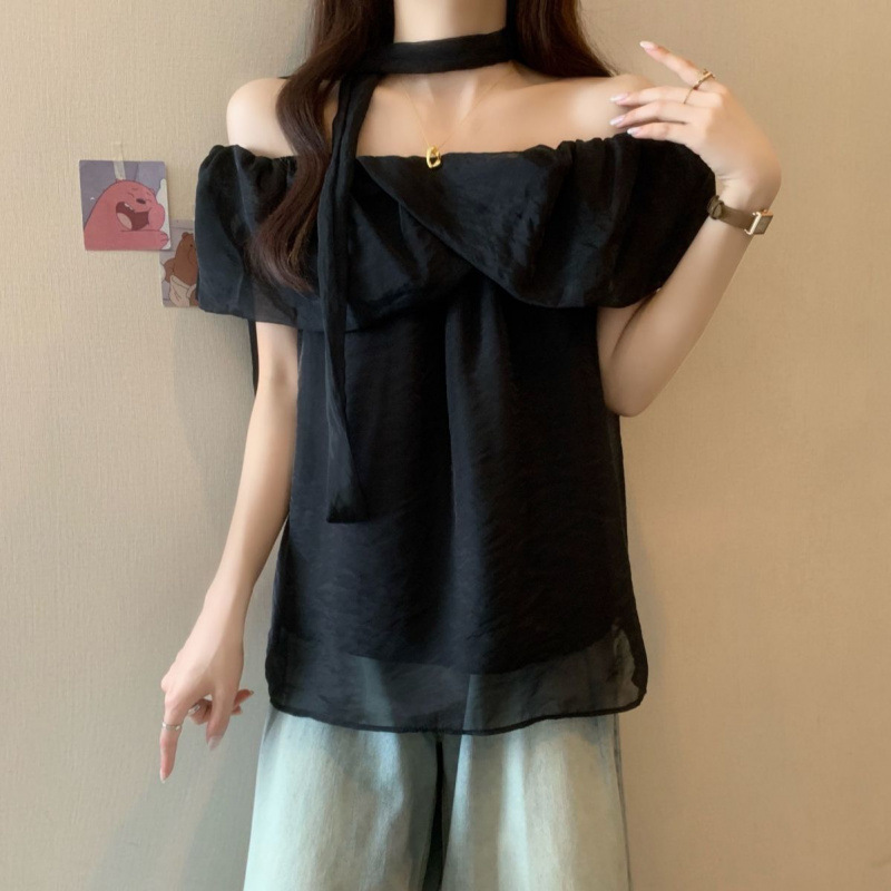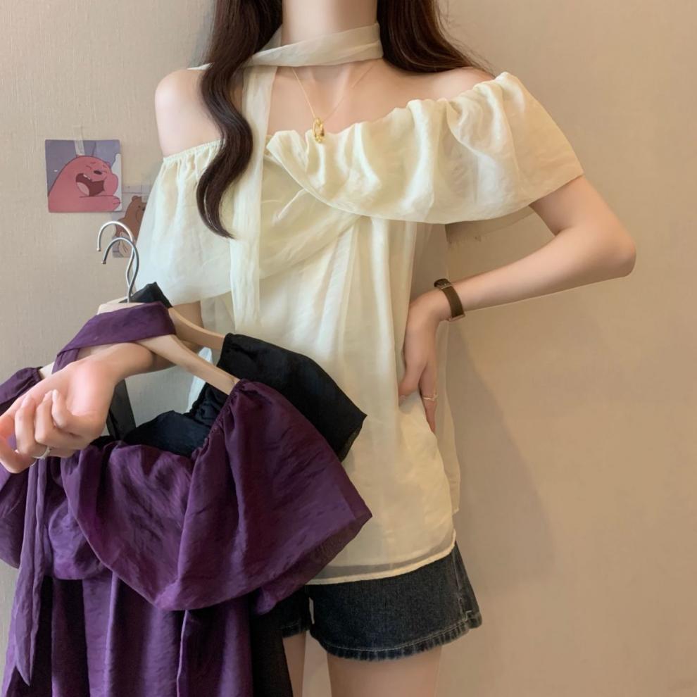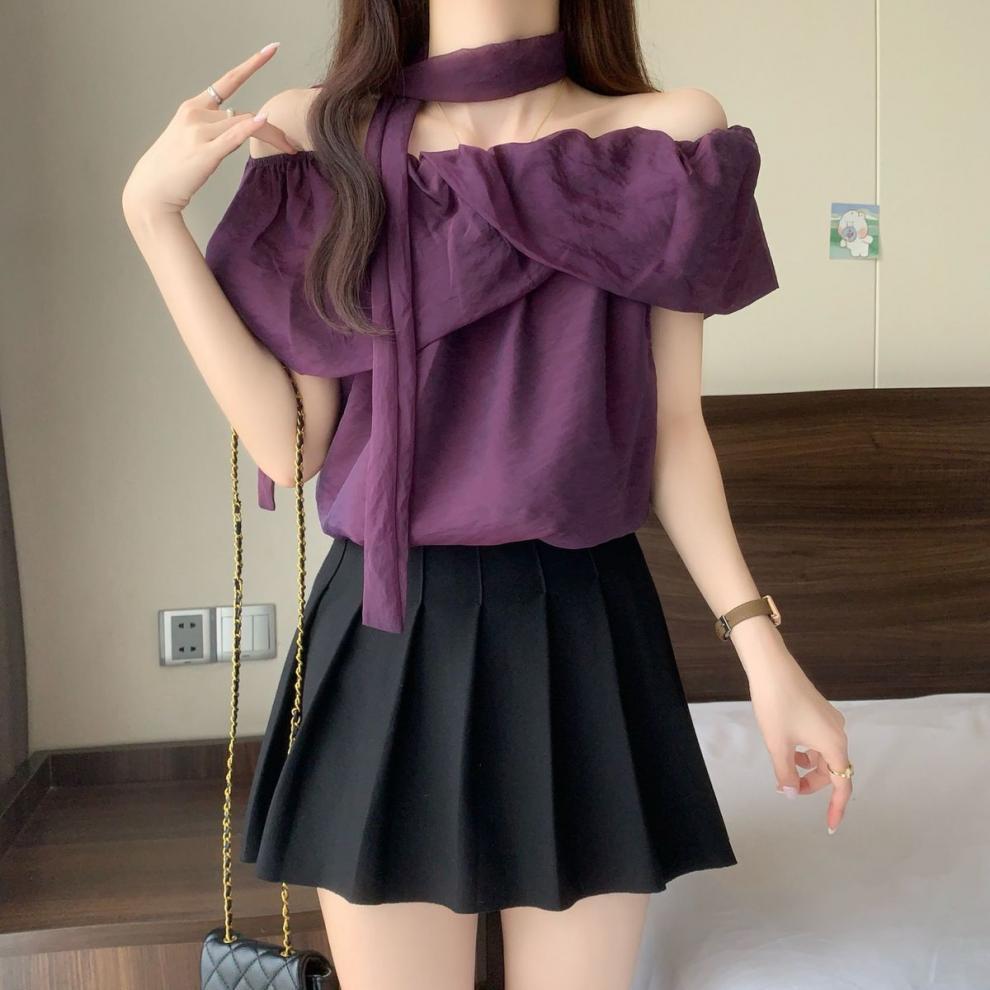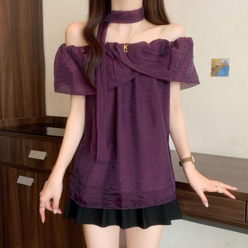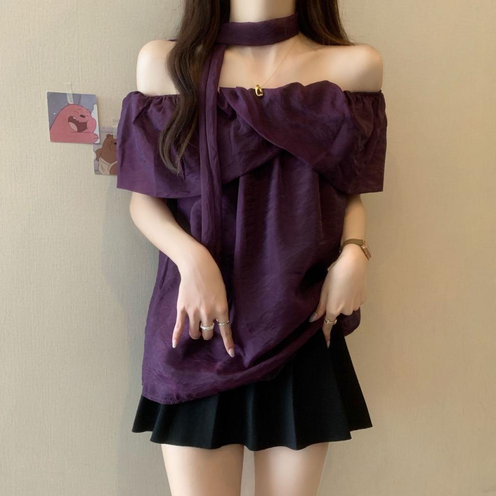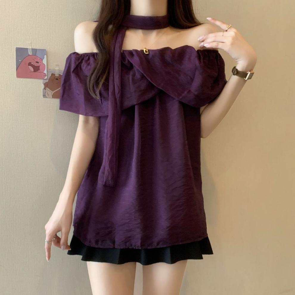 여름용 여성용 프렌치 원 숄더 홀터넥 퍼플 쉬폰 반팔 셔츠 플러스 사이즈 뚱뚱한 mm 차 오프 숄더 탑