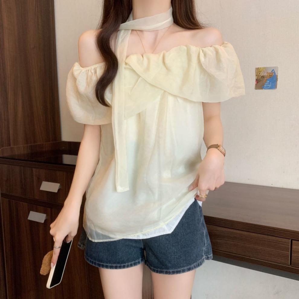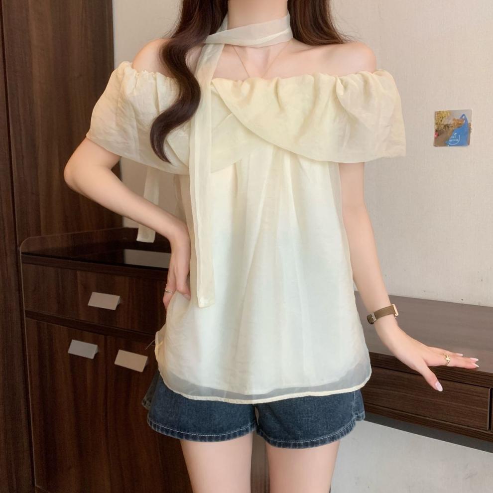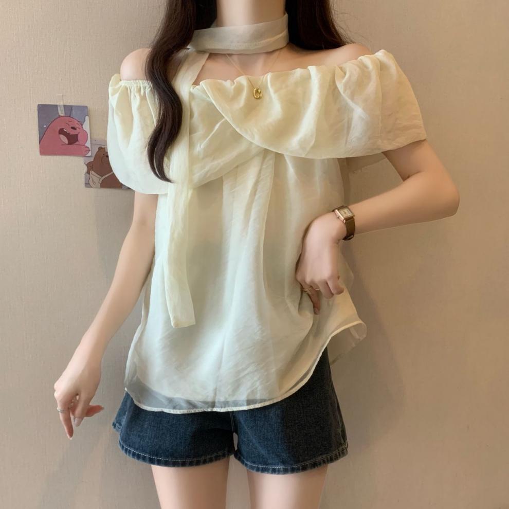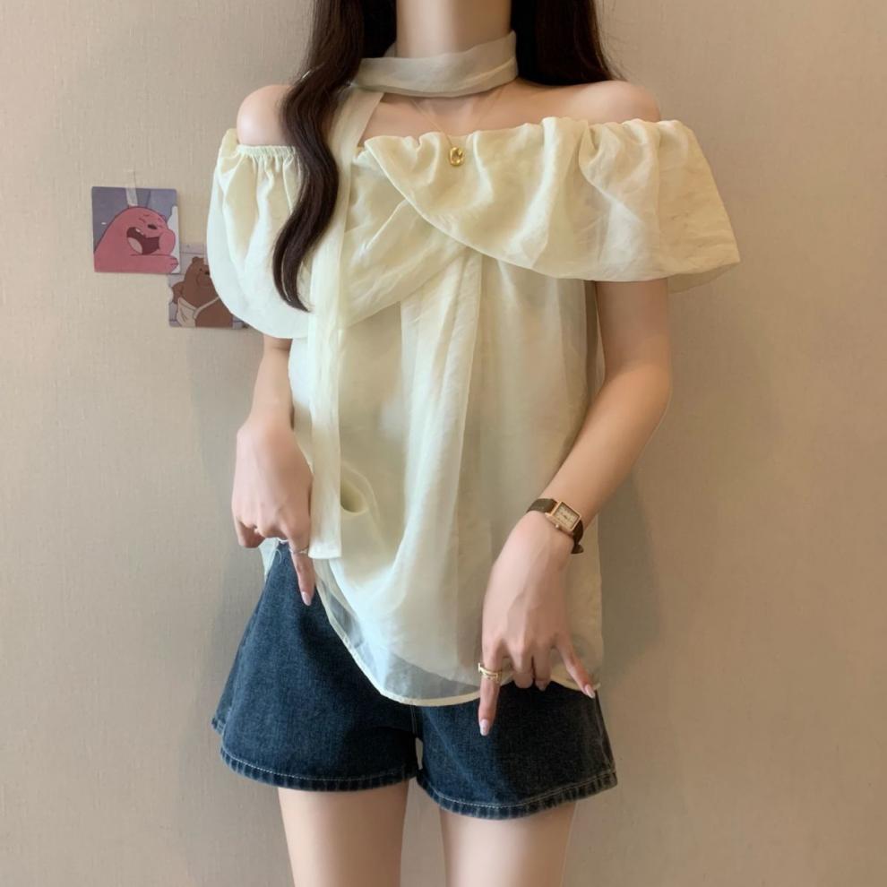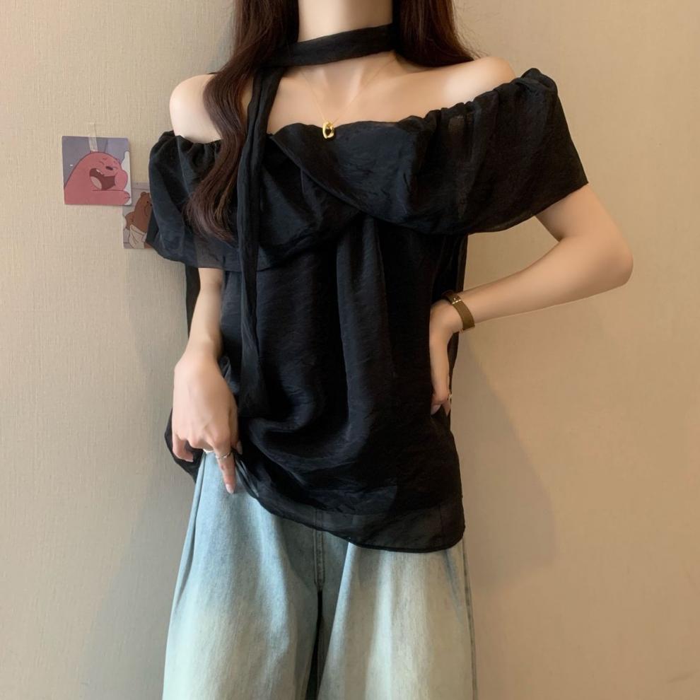 여름용 여성용 프렌치 원 숄더 홀터넥 퍼플 쉬폰 반팔 셔츠 플러스 사이즈 뚱뚱한 mm 차 오프 숄더 탑