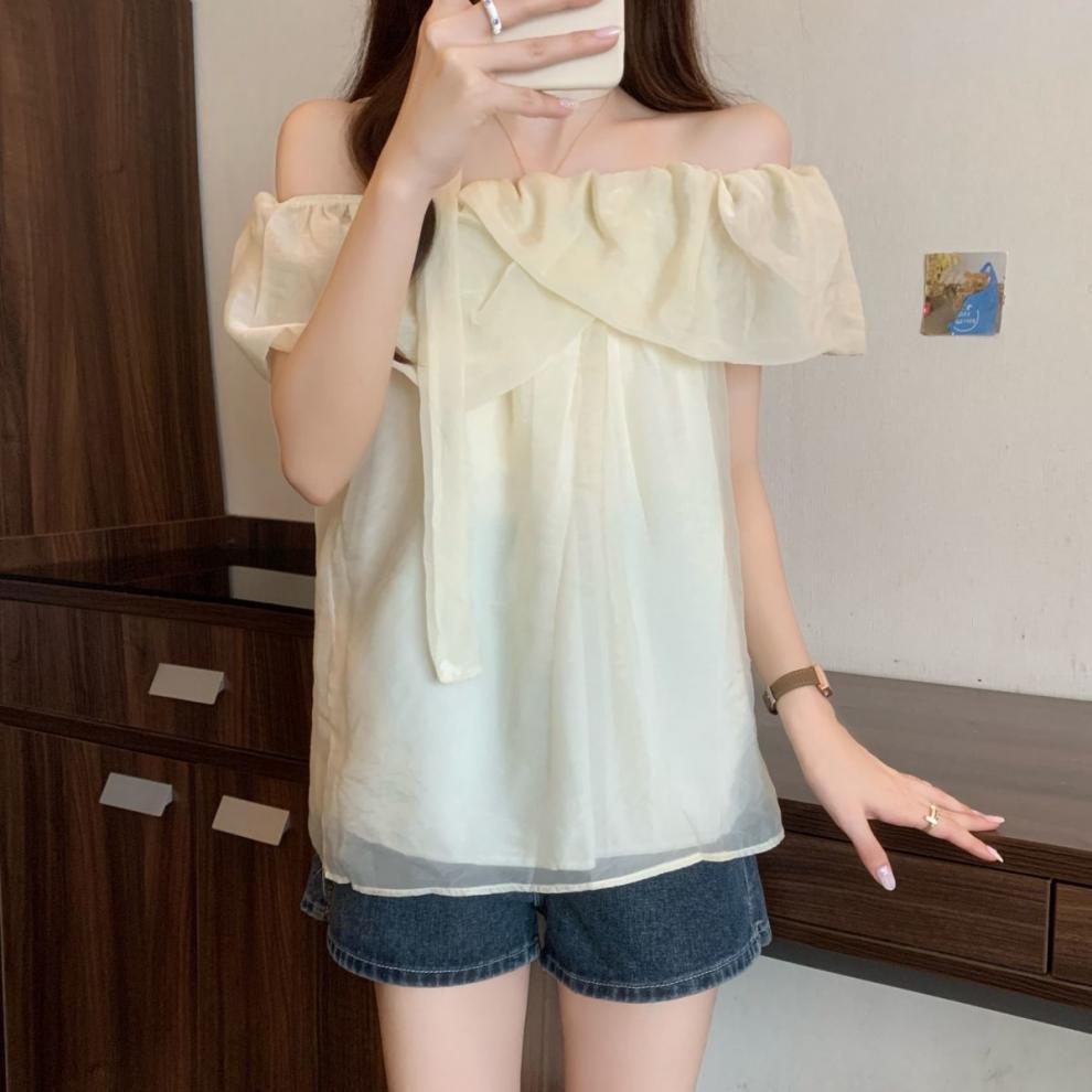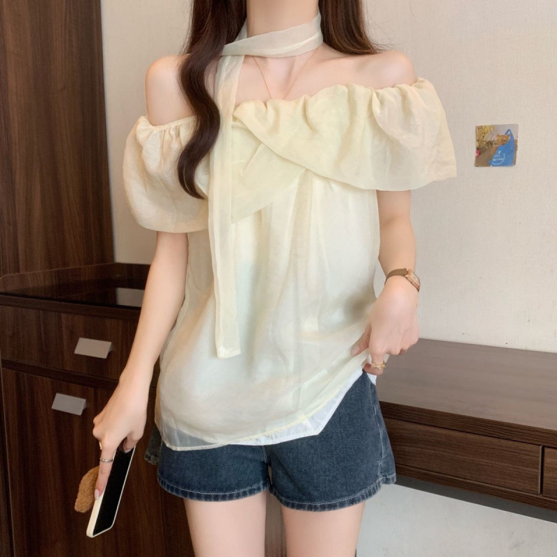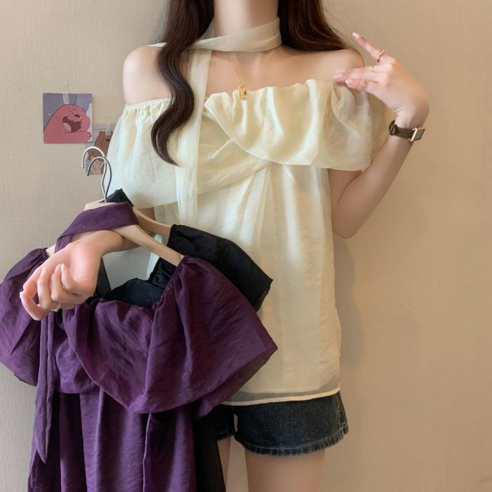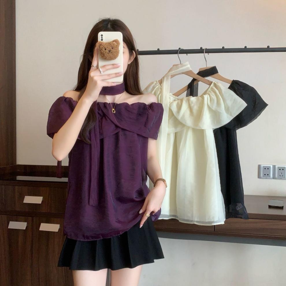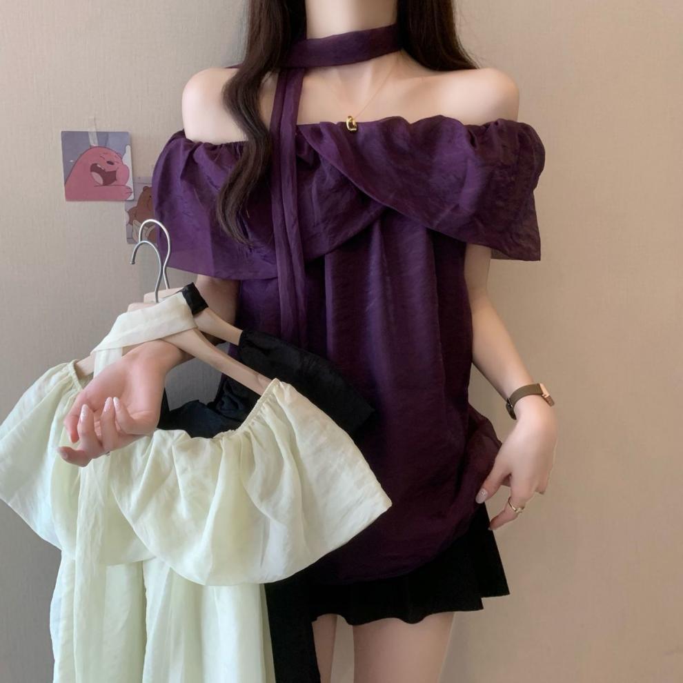 여름용 여성용 프렌치 원 숄더 홀터넥 퍼플 쉬폰 반팔 셔츠 플러스 사이즈 뚱뚱한 mm 차 오프 숄더 탑스토어 가기