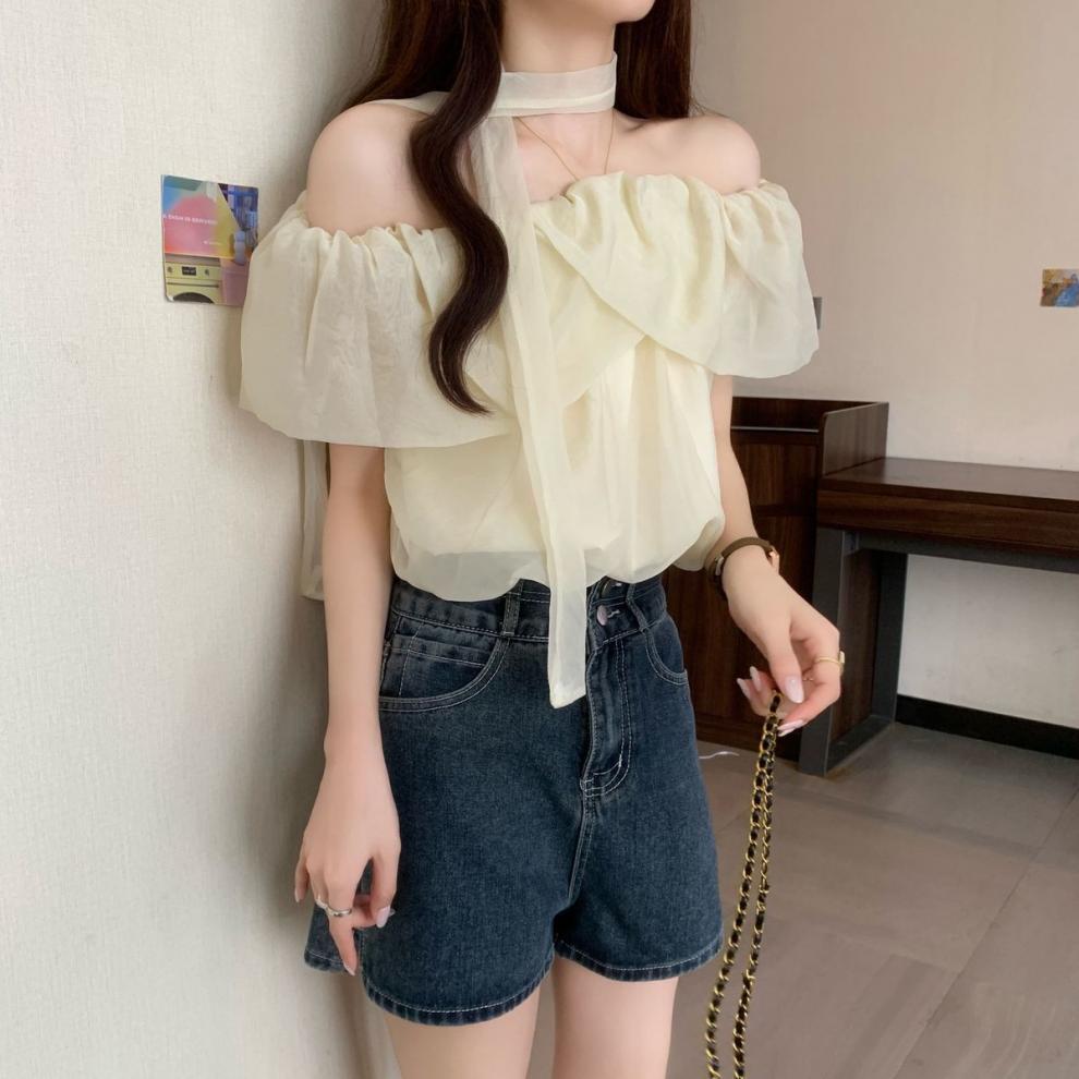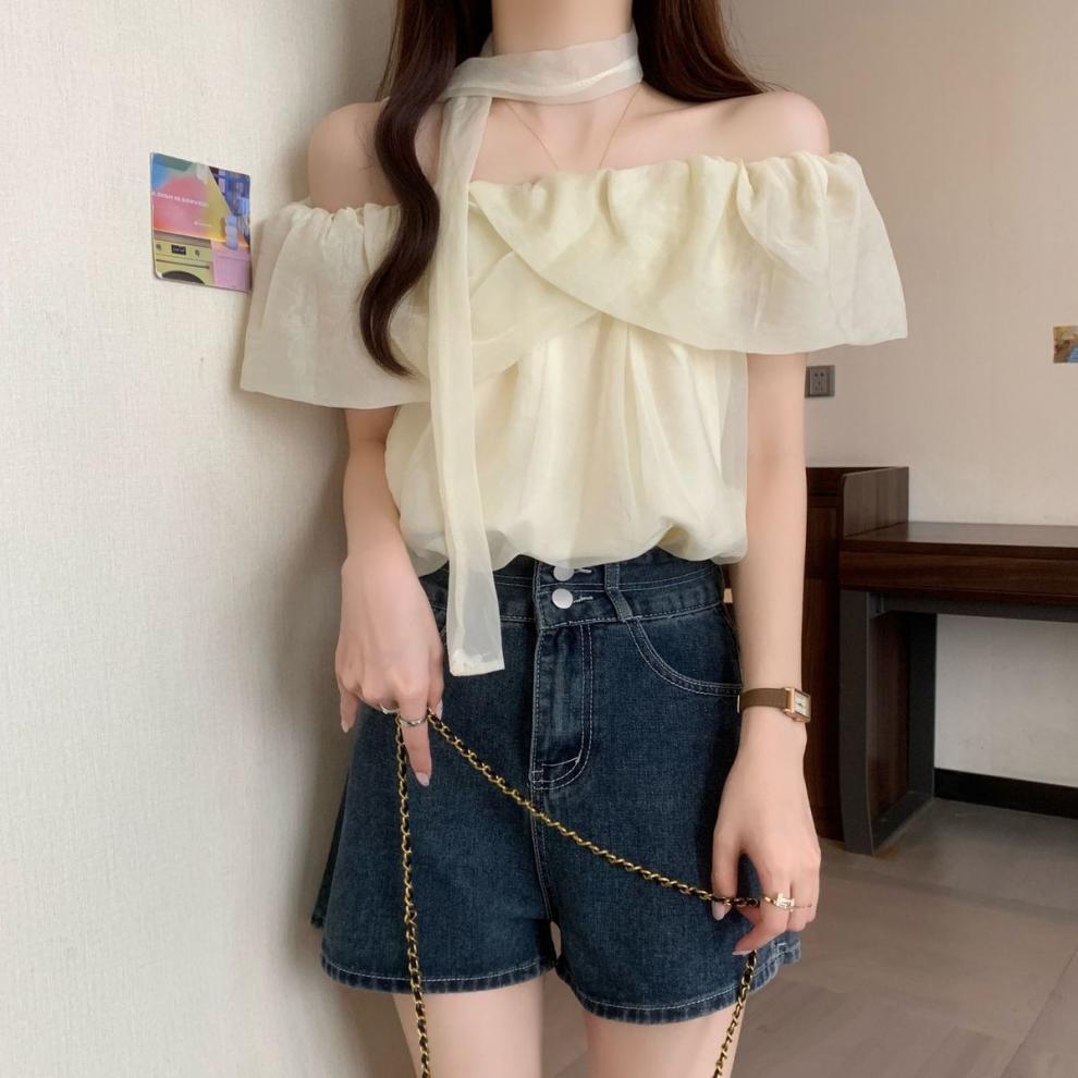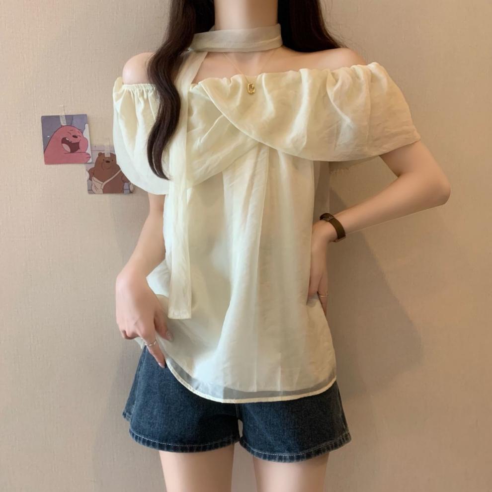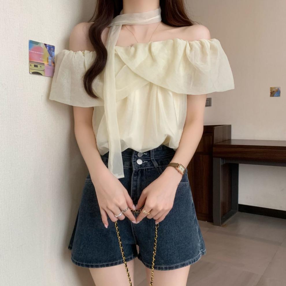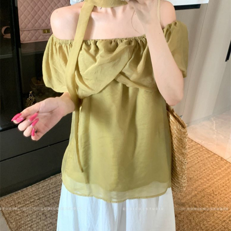 여름용 여성용 프렌치 원 숄더 홀터넥 퍼플 쉬폰 반팔 셔츠 플러스 사이즈 뚱뚱한 mm 차 오프 숄더 탑스토어 가기