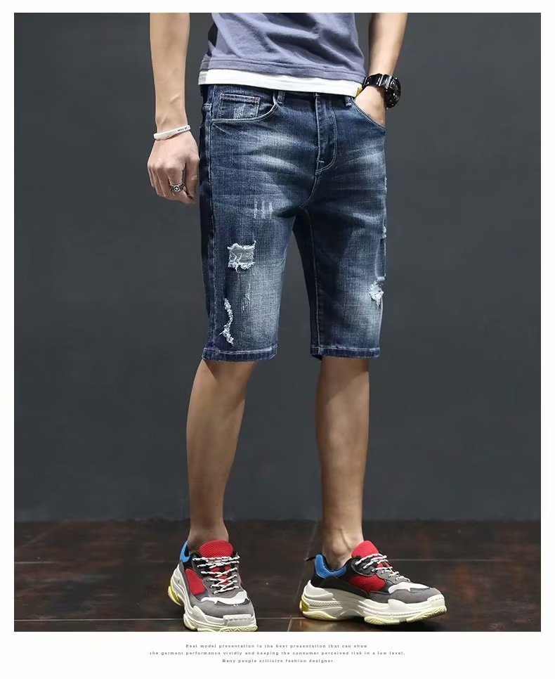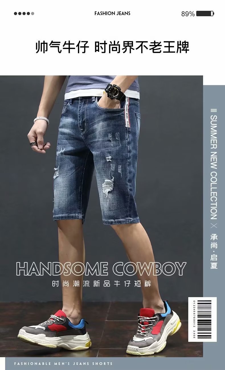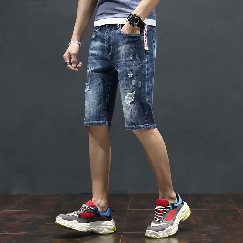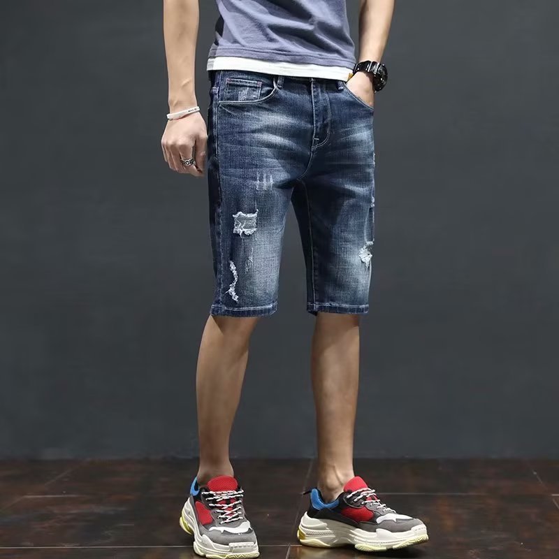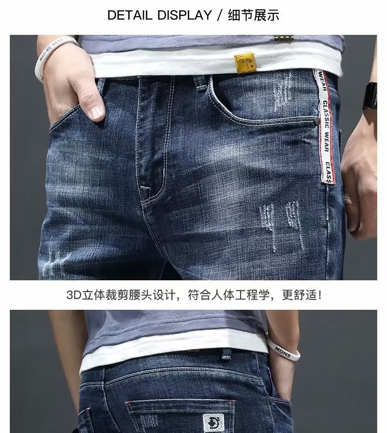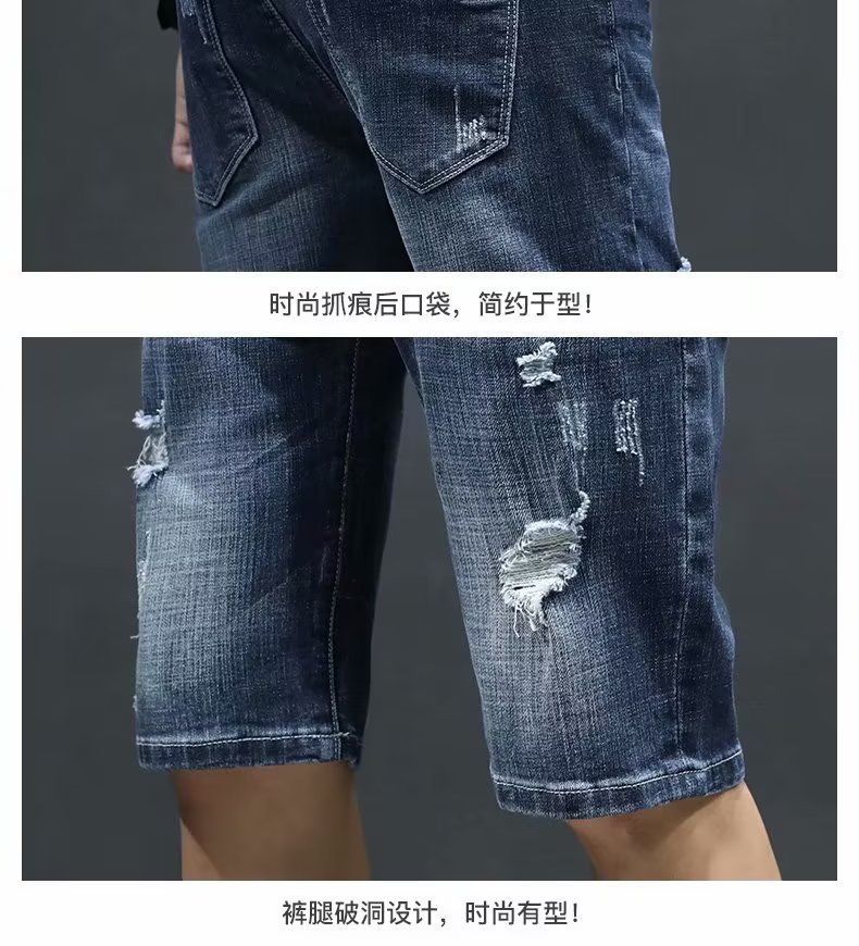 여름 얇은 청바지 남성 찢어진 트렌디하고 멋진 데님 반바지 2025 새로운 슬림 스트레이트 5부 바지스토어 가기