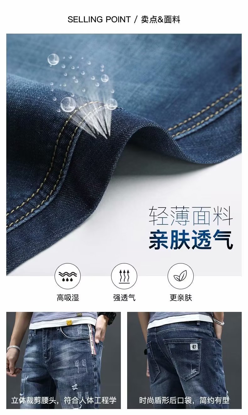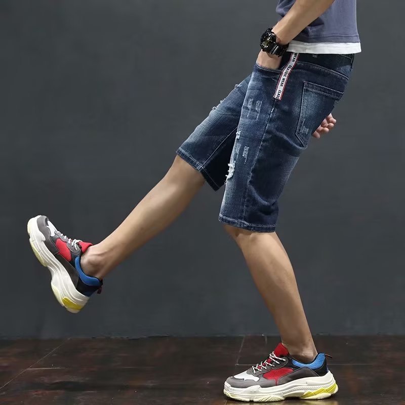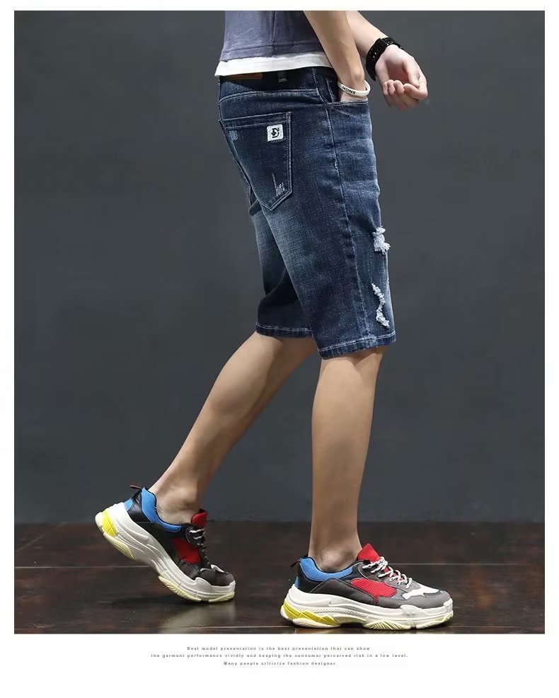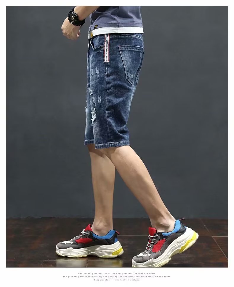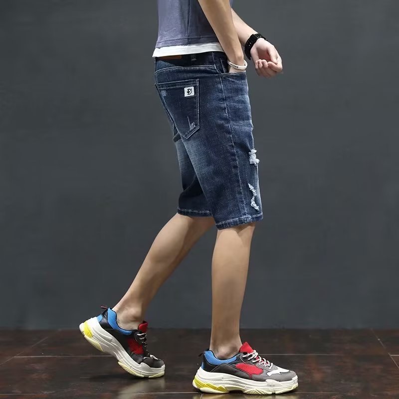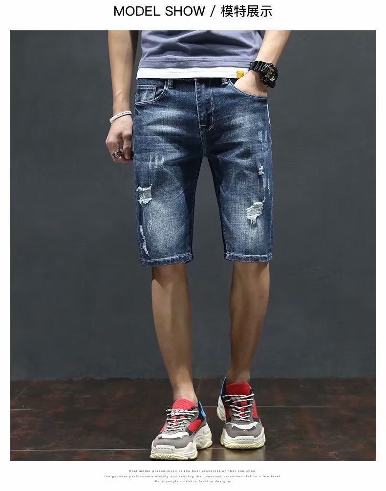 여름 얇은 청바지 남성 찢어진 트렌디하고 멋진 데님 반바지 2025 새로운 슬림 스트레이트 5부 바지스토어 가기