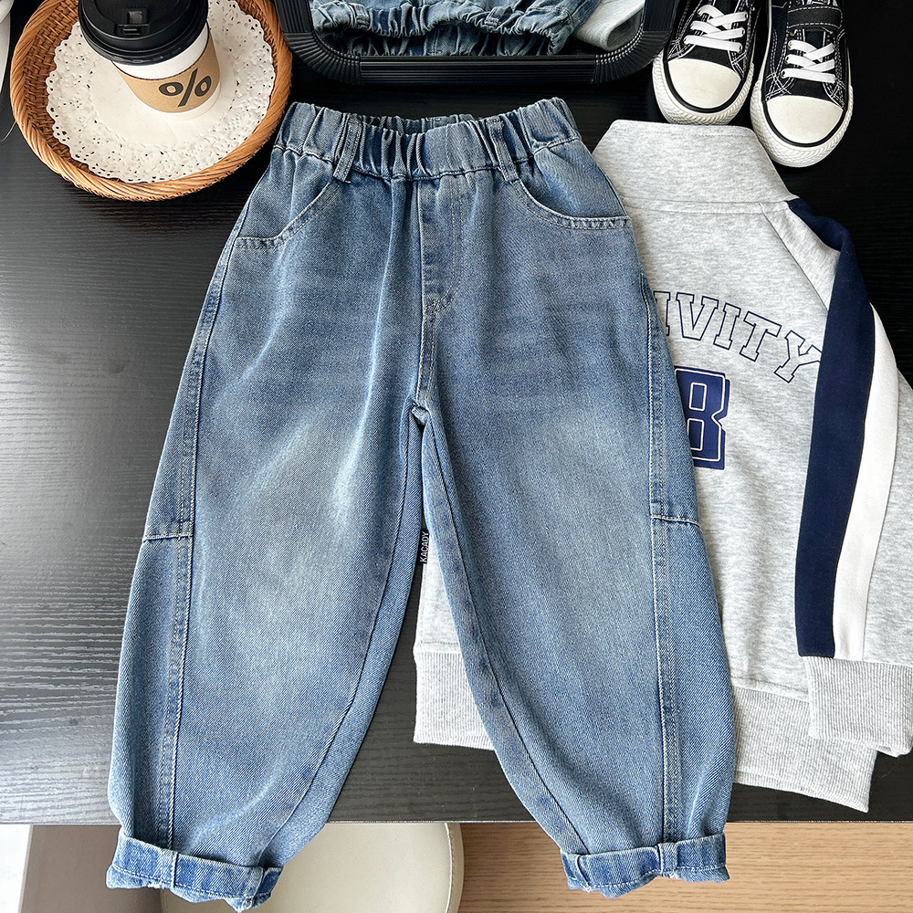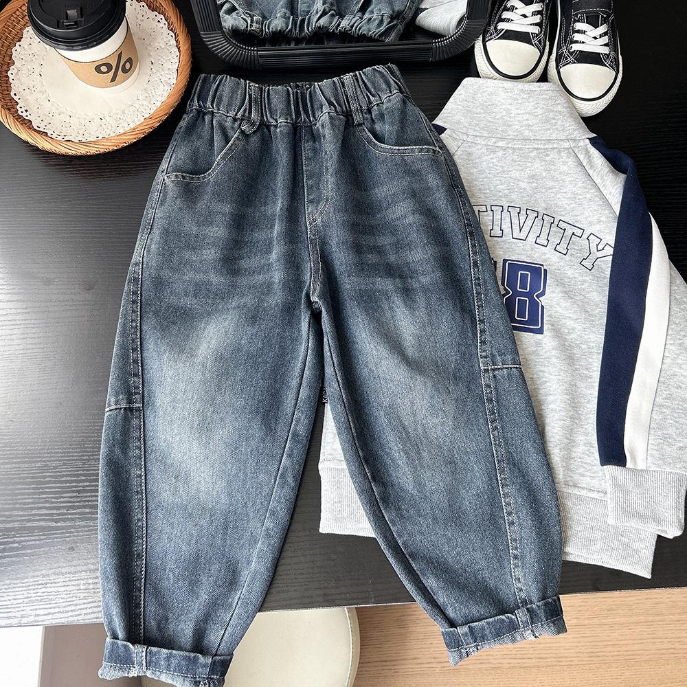 2025 가을 아동복 소년과 어린이 유행 가정용 아동복 공급 접합 수염 스트레이트 데님 바지 도매스토어 가기