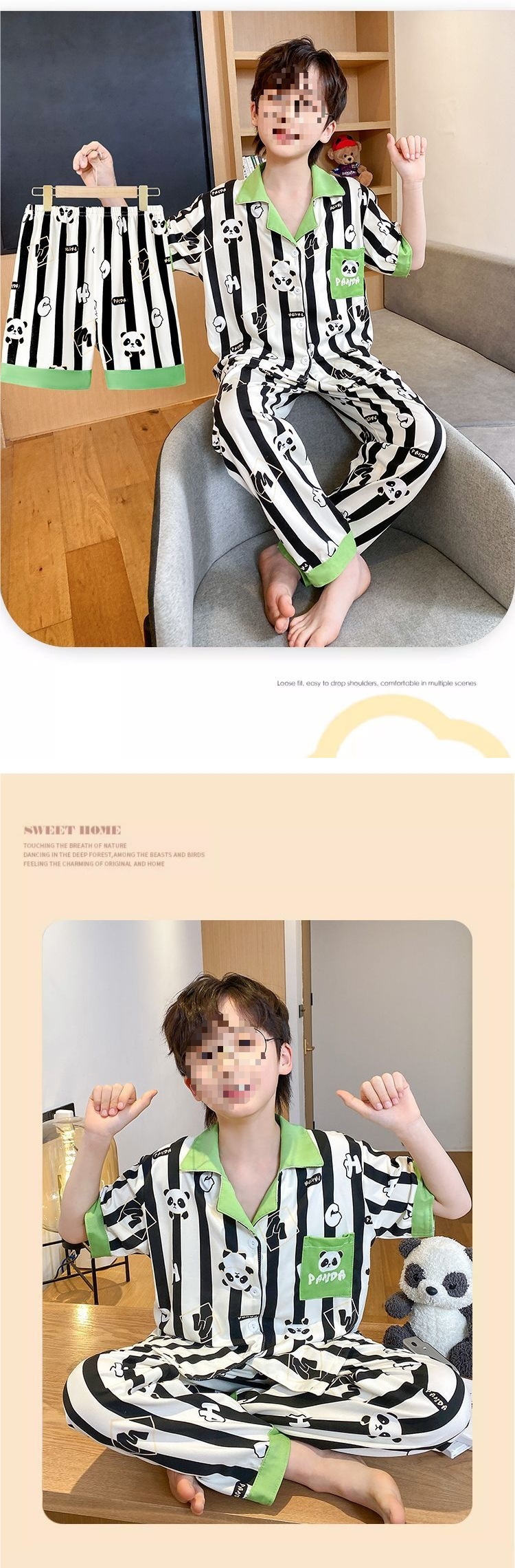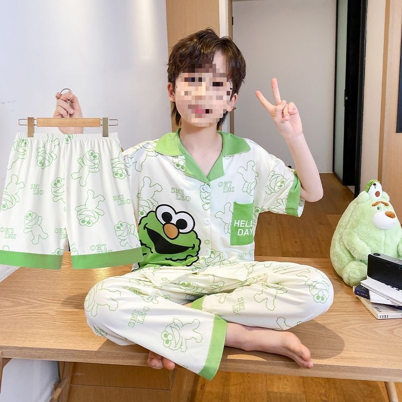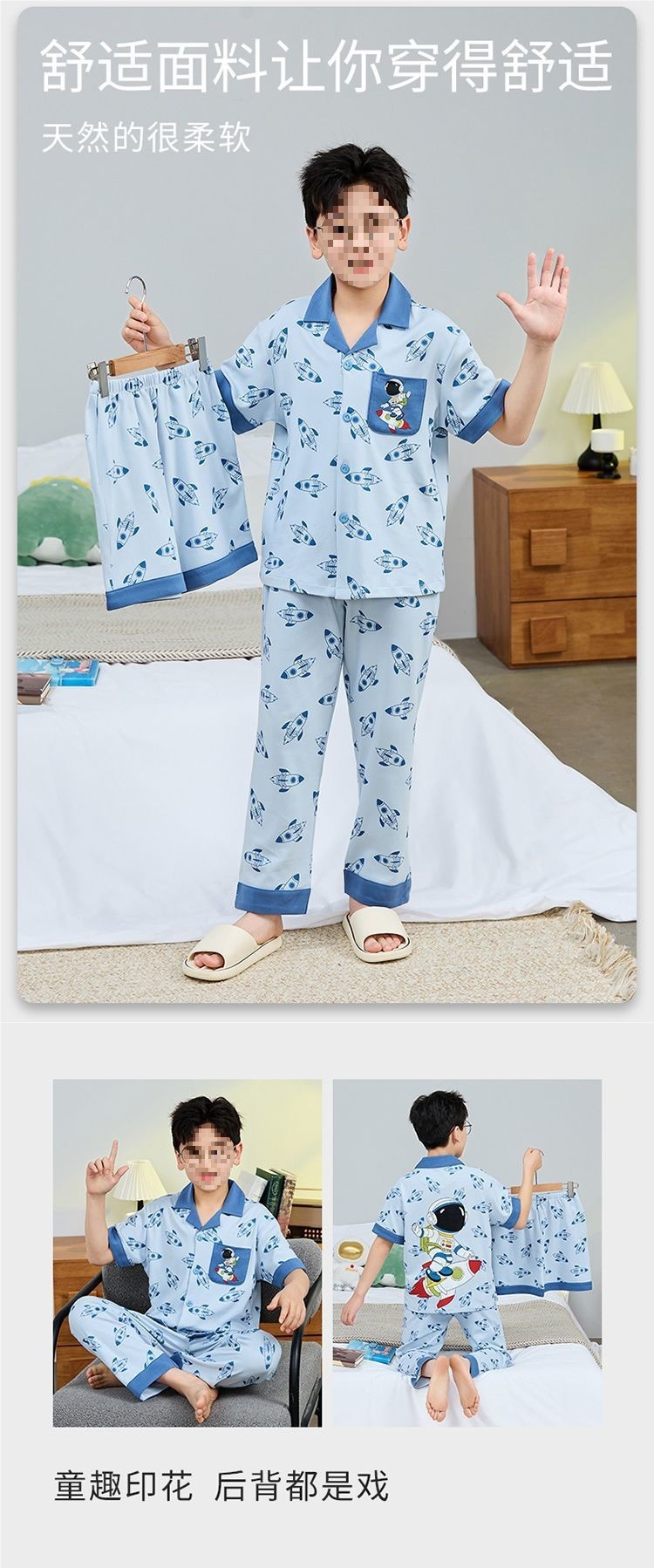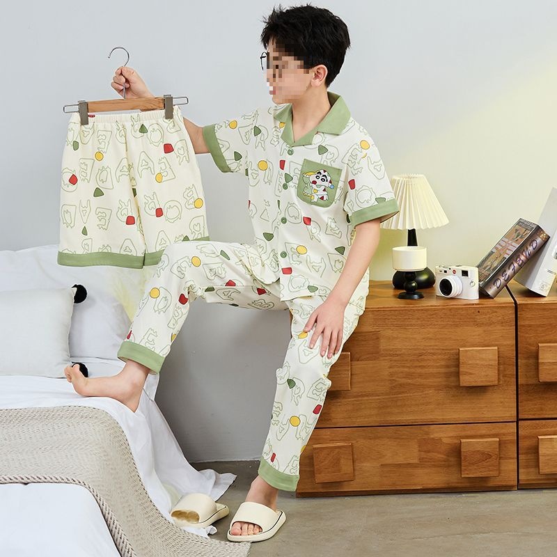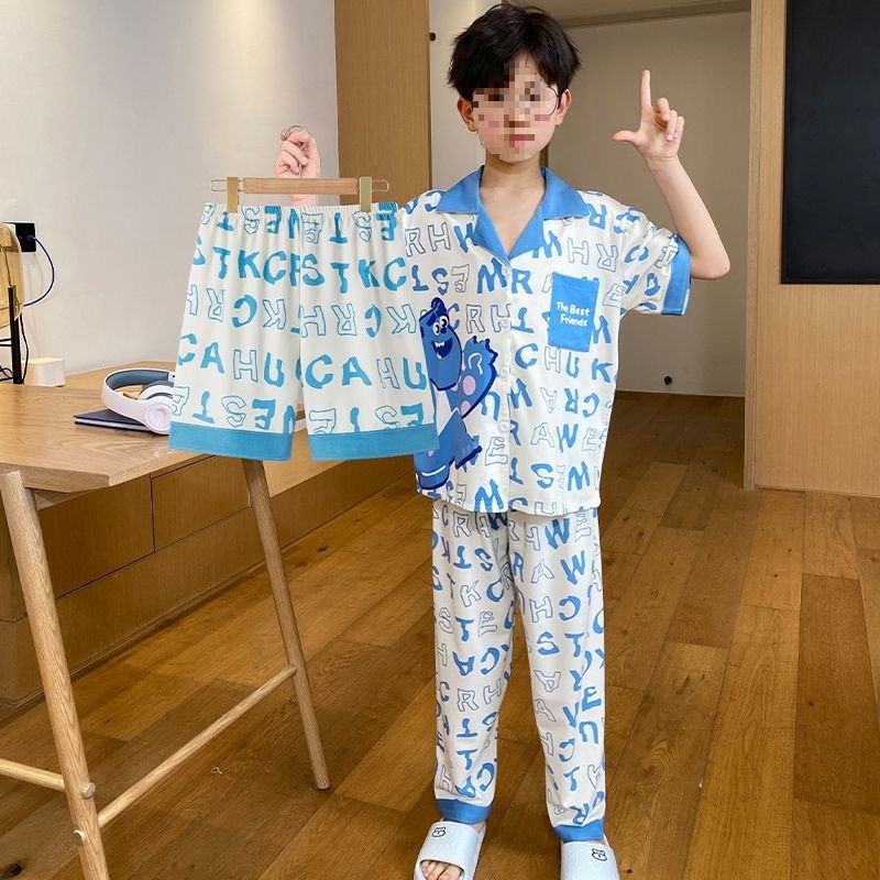 소년 여름 반팔 바지 느슨한 잠옷 3 피스 세트 얇은 만화 중형 및 대형 소년은 집 밖에서 옷을 입을 수 있습니다