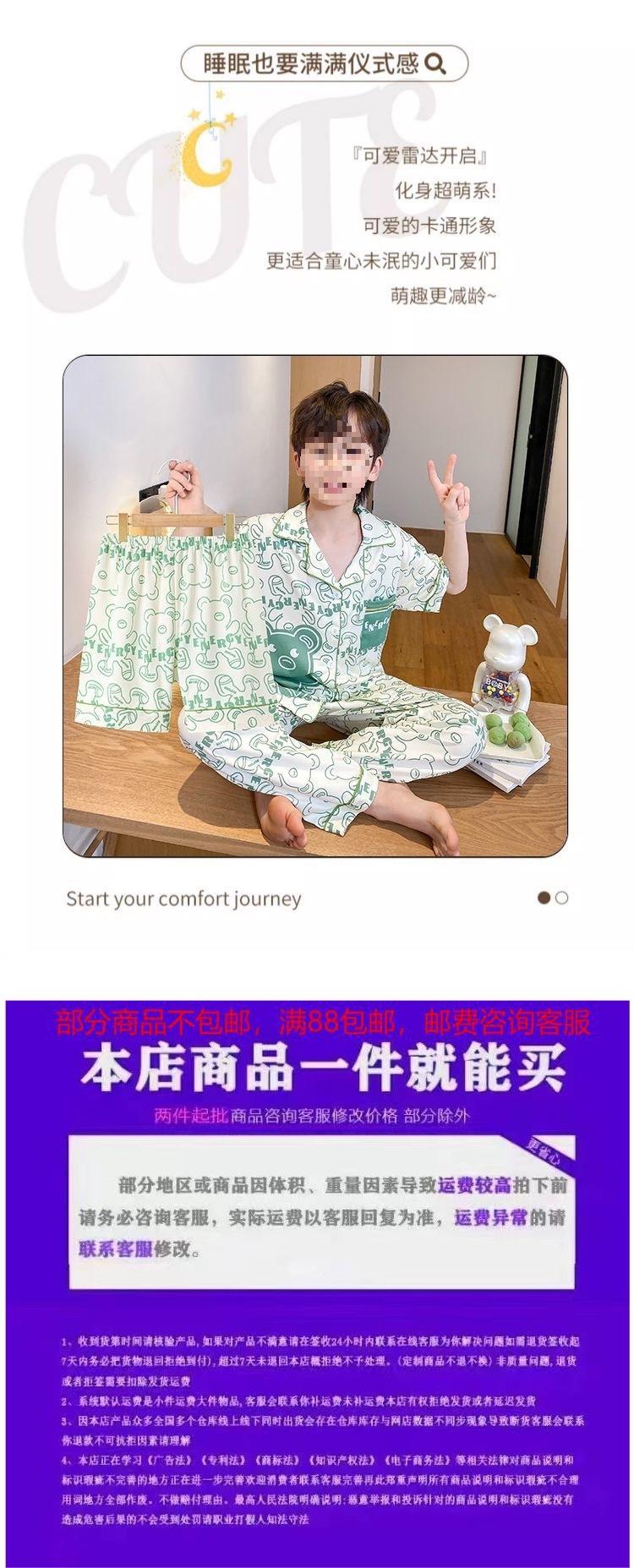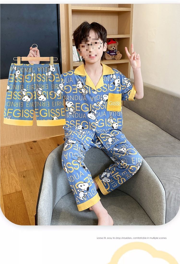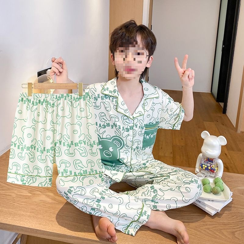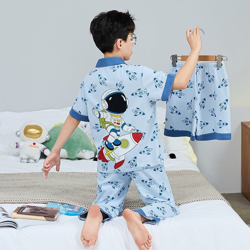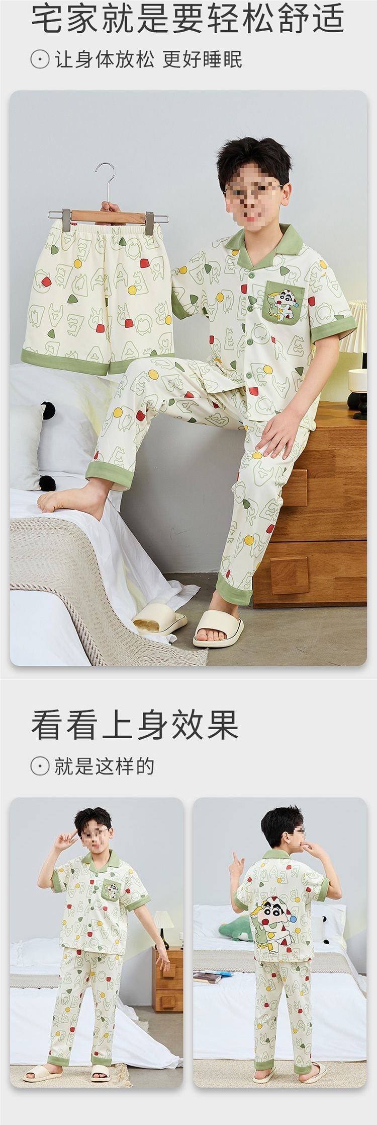 소년 여름 반팔 바지 느슨한 잠옷 3 피스 세트 얇은 만화 중형 및 대형 소년은 집 밖에서 옷을 입을 수 있습니다