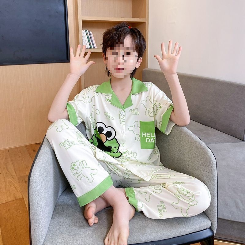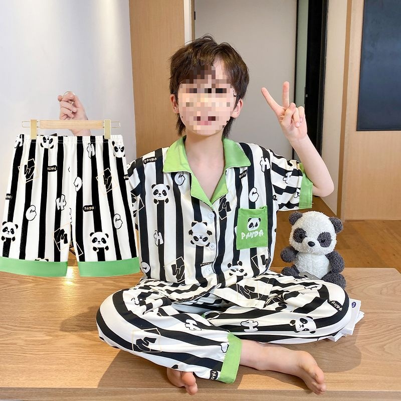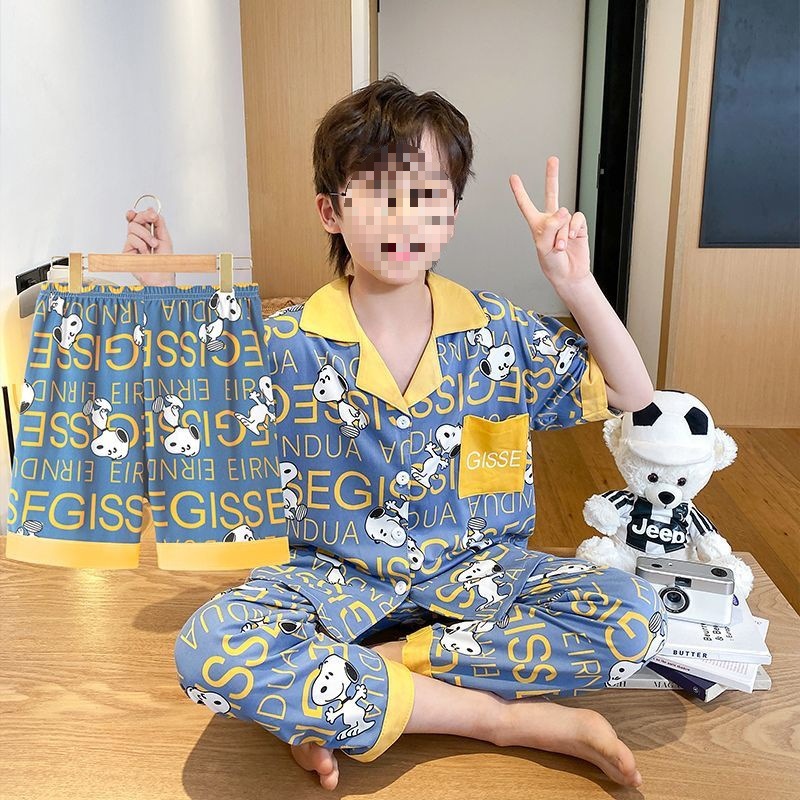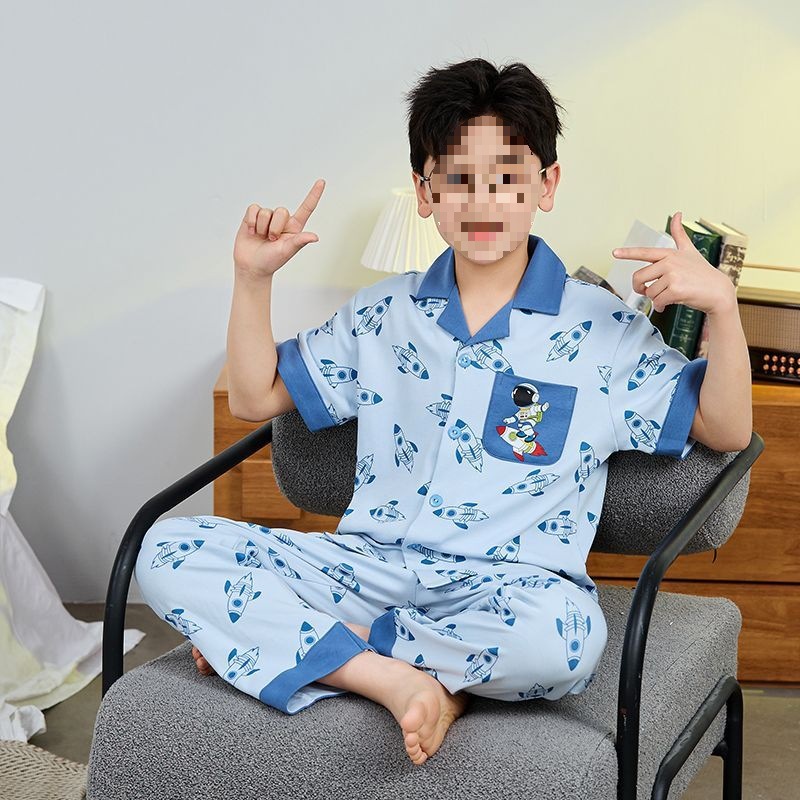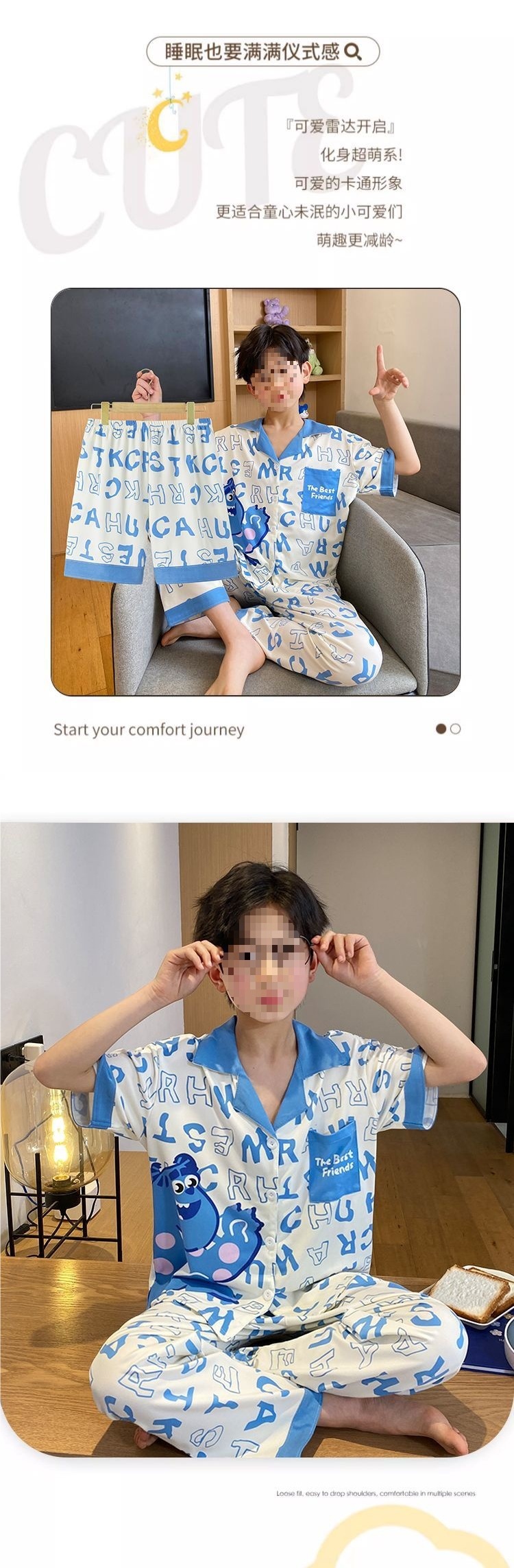 소년 여름 반팔 바지 느슨한 잠옷 3 피스 세트 얇은 만화 중형 및 대형 소년은 집 밖에서 옷을 입을 수 있습니다