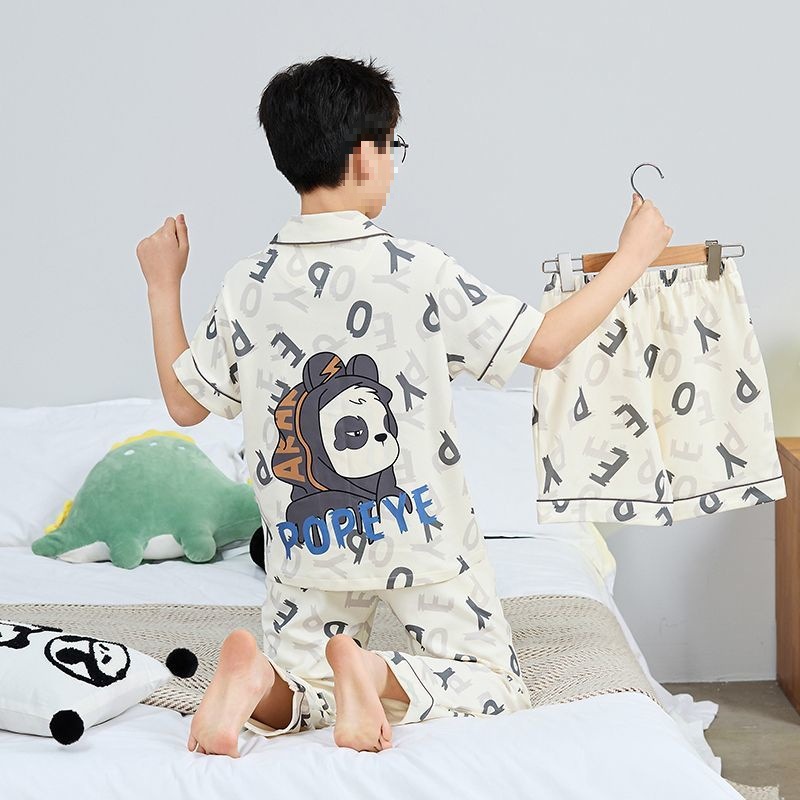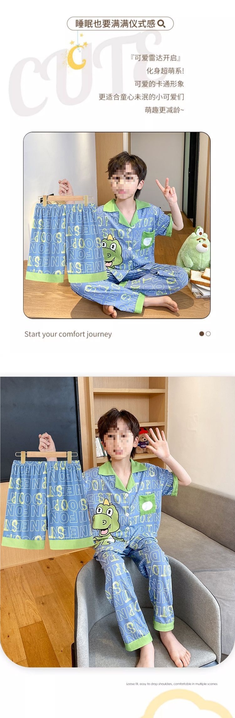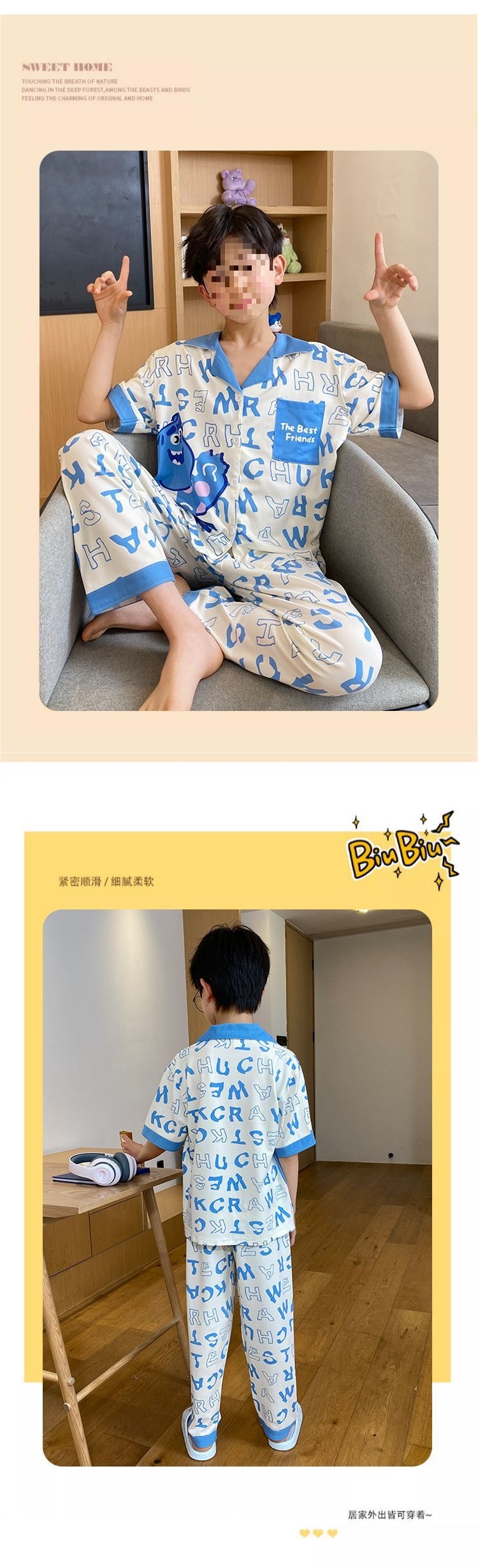 소년 여름 반팔 바지 느슨한 잠옷 3 피스 세트 얇은 만화 중형 및 대형 소년은 집 밖에서 옷을 입을 수 있습니다스토어 가기