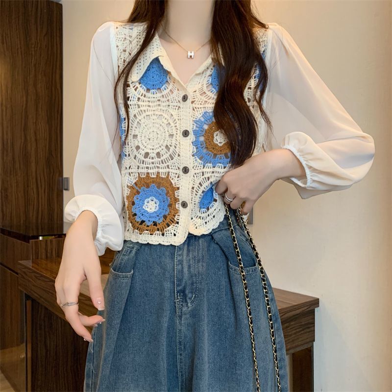 2025 봄 여름 새로운 틈새 한국 디자인 중공 스웨터 레이스 긴팔 칼라 쉬폰 셔츠 여성용