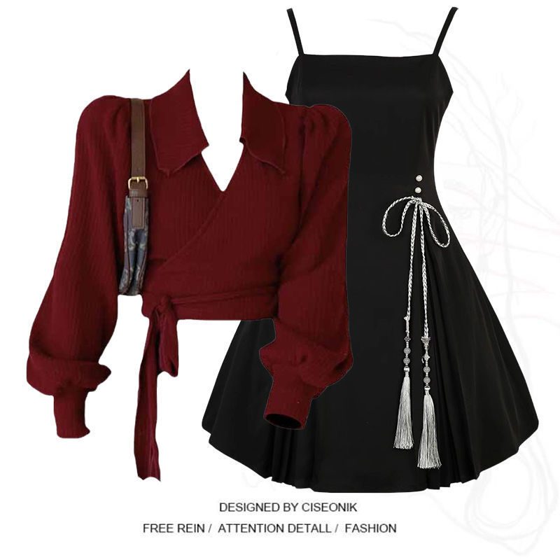 2025년 여성을 위한 새로운 홍콩 스타일 패셔너블한 라펠 버건디 탑과 슬림한 여성을 위한 서스펜더 드레스 투피스 세트스토어 가기