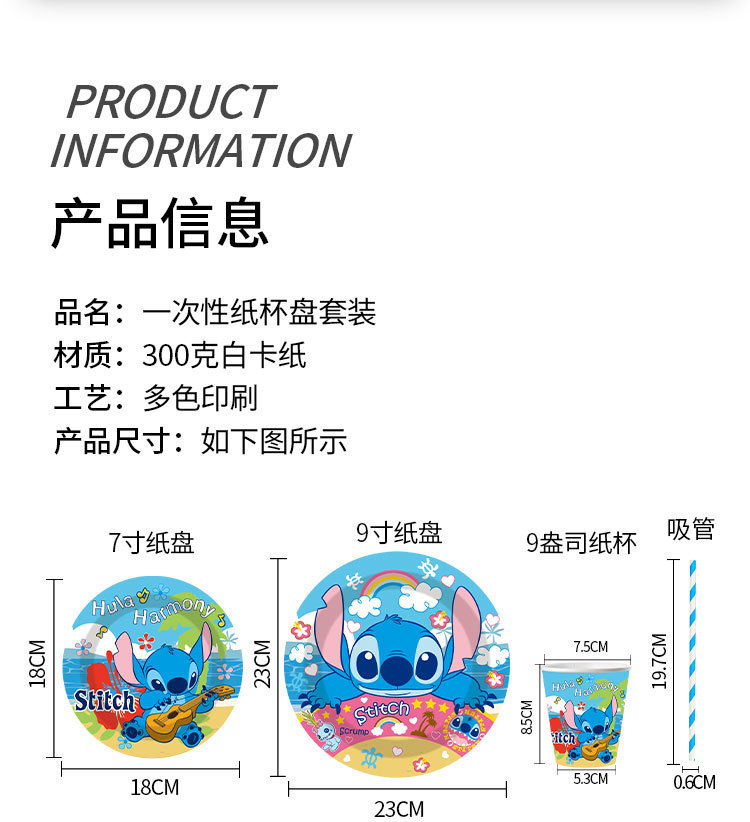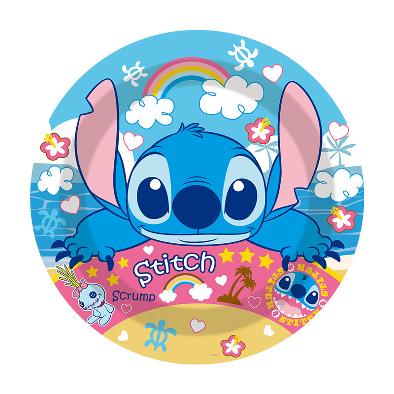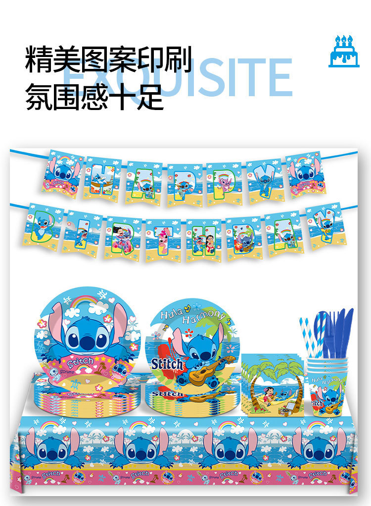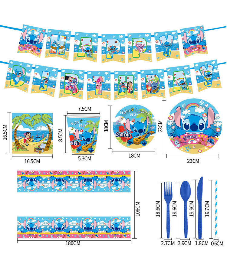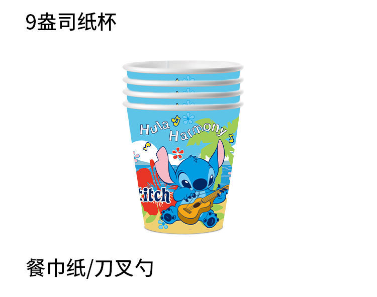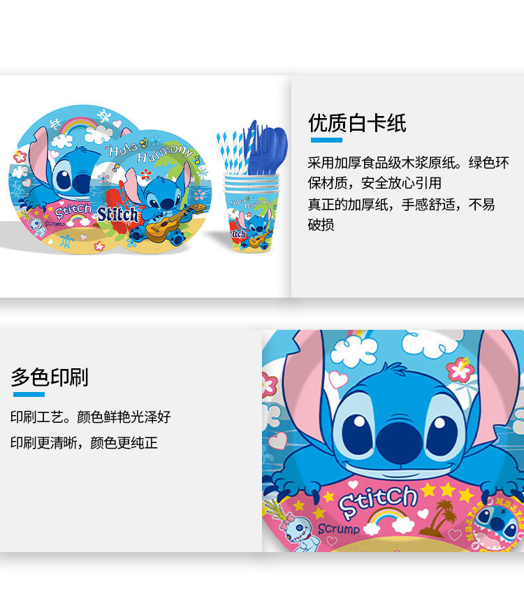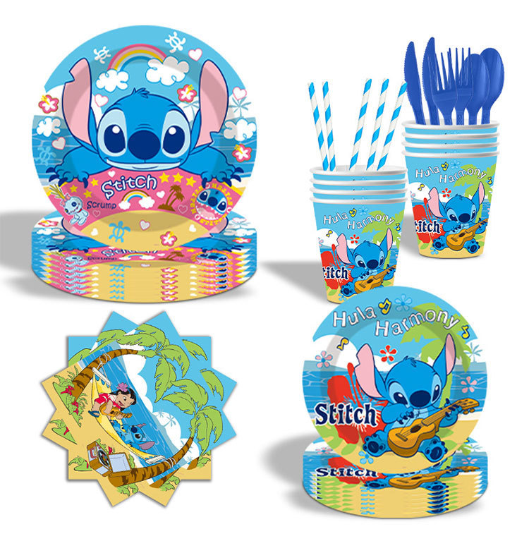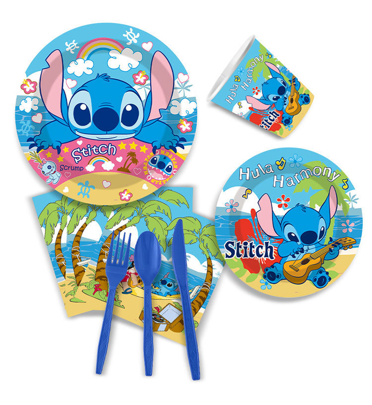 스티치 테마 일회용 종이 접시, 종이컵, 식기 세트, 어린이 만화 생일 파티 장소 레이아웃 소품스토어 가기