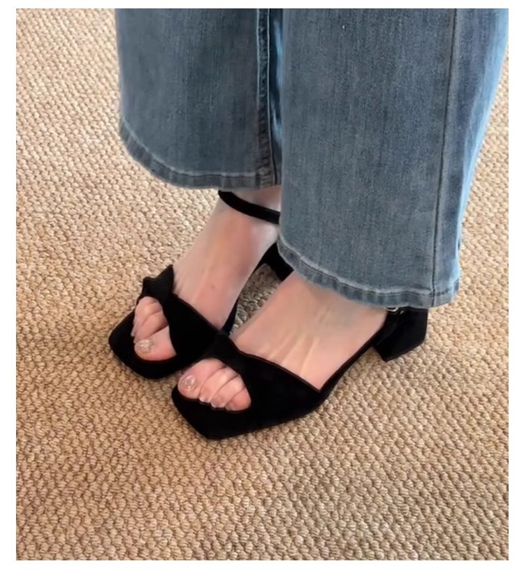 패턴 제작 중~ 프렌치 스타일의 심플한 두꺼운 굽 샌들, 스커트와 매치하기 좋은 통근용 오픈토 로만 샌들