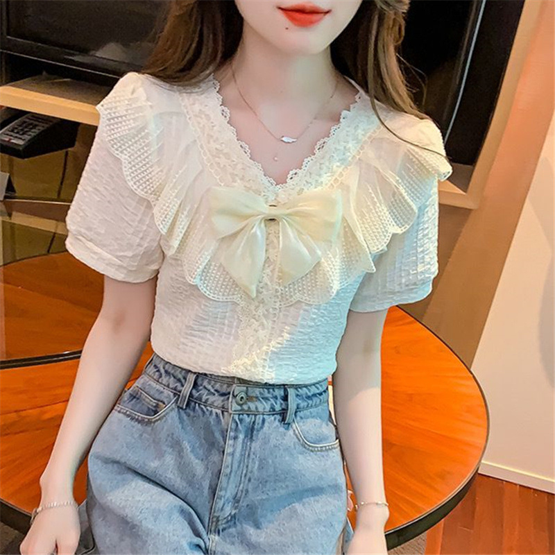 여성을위한 프렌치 브이넥 레이스 쉬폰 셔츠 2025 봄 새로운 스타일의 아름다운 셔츠 루즈 슬리밍 반팔 탑