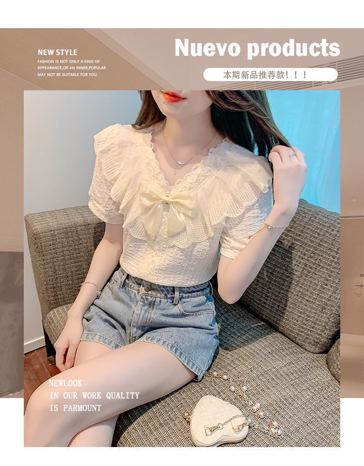 여성을위한 프렌치 브이넥 레이스 쉬폰 셔츠 2025 봄 새로운 스타일의 아름다운 셔츠 루즈 슬리밍 반팔 탑스토어 가기