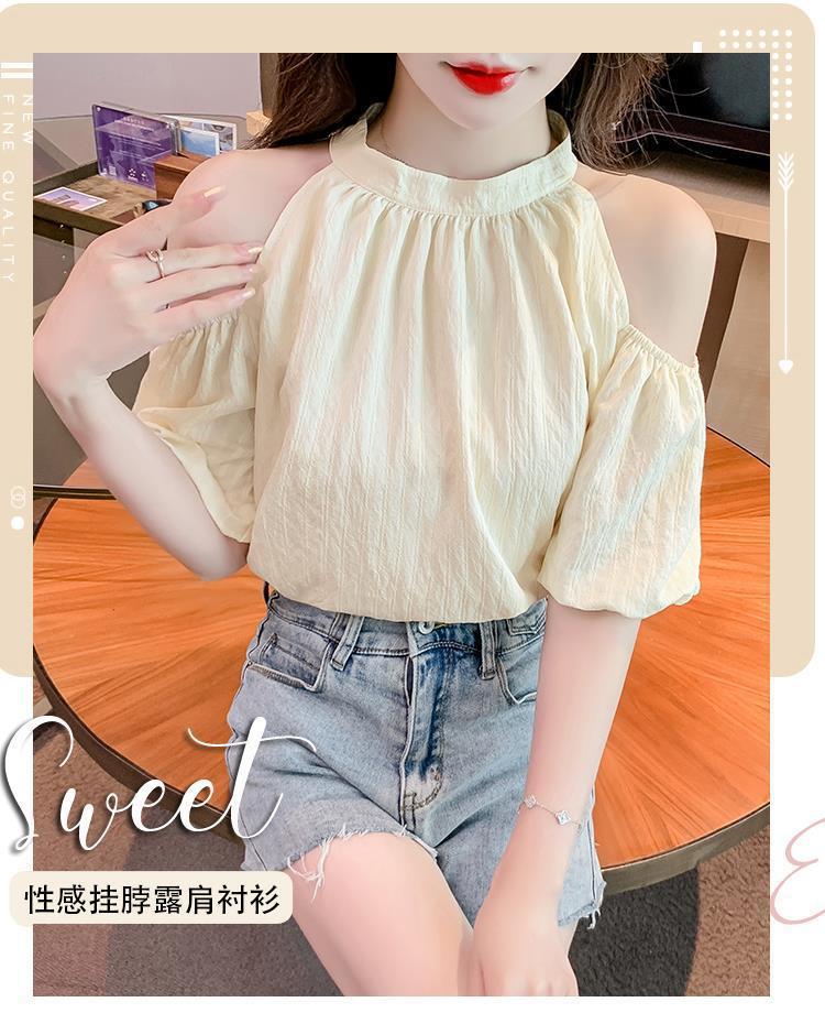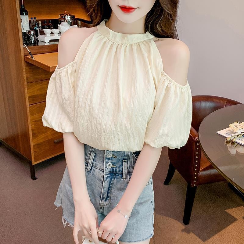 여름 여성을 위한 프렌치 스타일 리본 오프숄더 쉬폰 셔츠, 스위트 홀터넥 퍼프 슬리브 셔츠, 루즈 탑