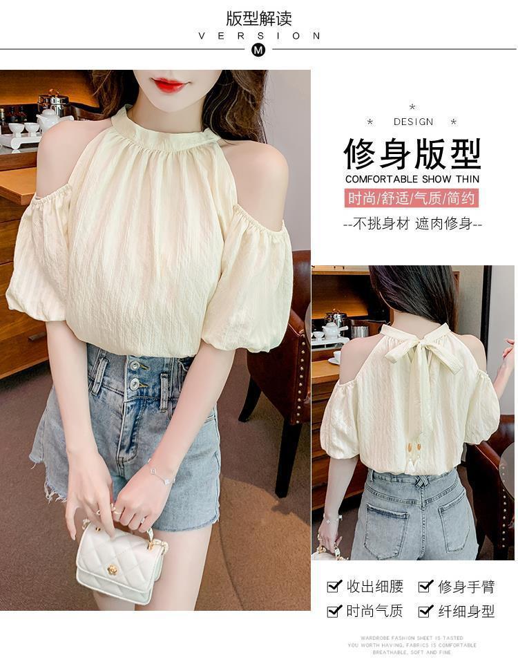 여름 여성을 위한 프렌치 스타일 리본 오프숄더 쉬폰 셔츠, 스위트 홀터넥 퍼프 슬리브 셔츠, 루즈 탑스토어 가기
