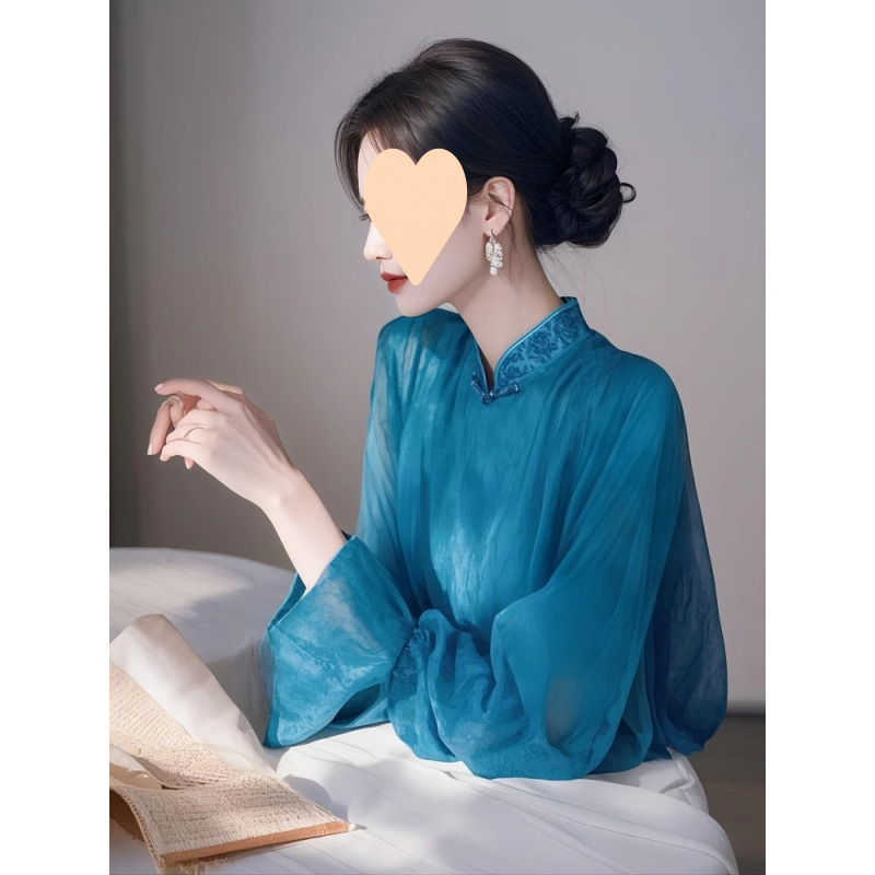 여성을위한 새로운 중국 스타일 블루 쉬폰 셔츠 2025 봄 새로운 스타일 라이트 럭셔리 하이 엔드 독특한 외국 스타일 세련된 셔츠스토어 가기