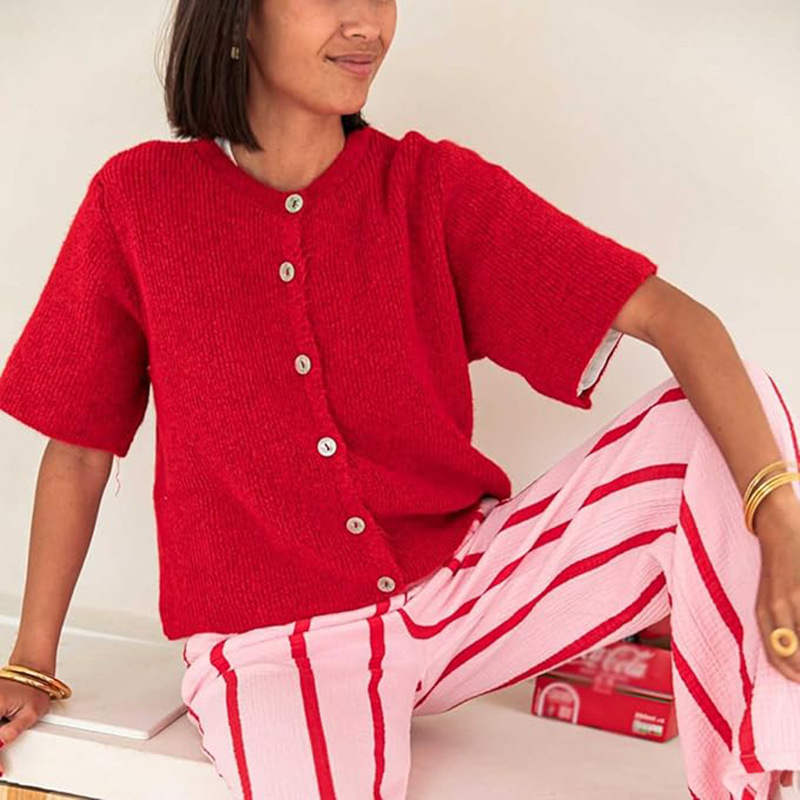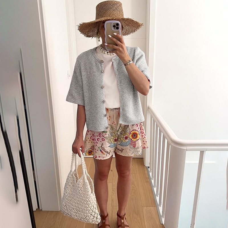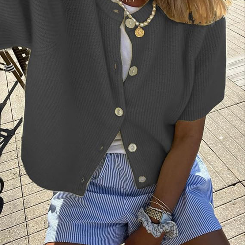 유럽과 미국 여성 버튼 반팔 카디건 스웨터 짧은 경량 라운드 넥 우아한 니트 탑 Amazon스토어 가기