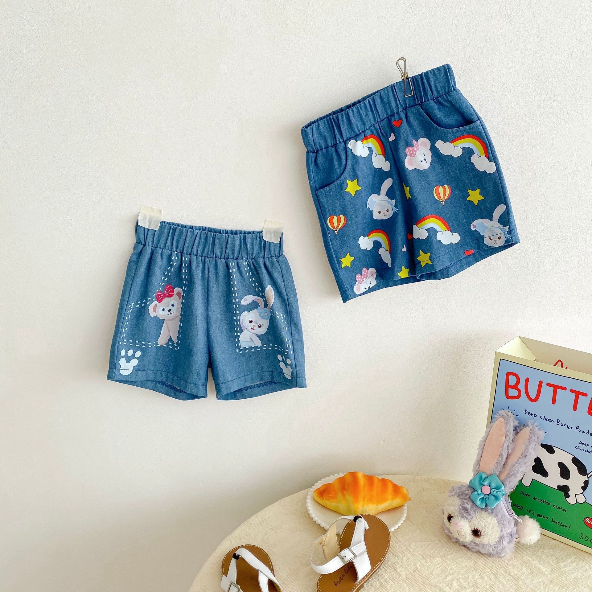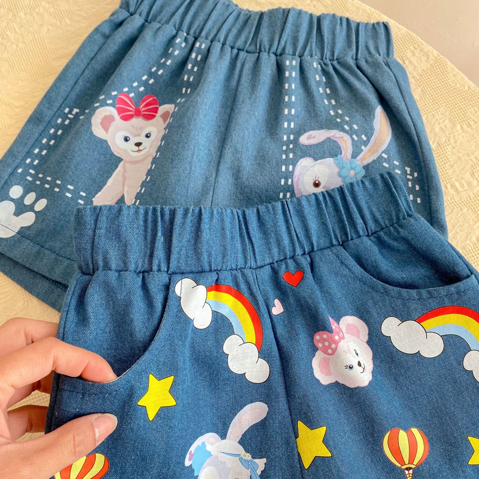 여아 정장 여름 새로운 유럽과 미국 아동 캐주얼 반팔 신축성있는 허리 바지 아동 느슨한 데님 반바지