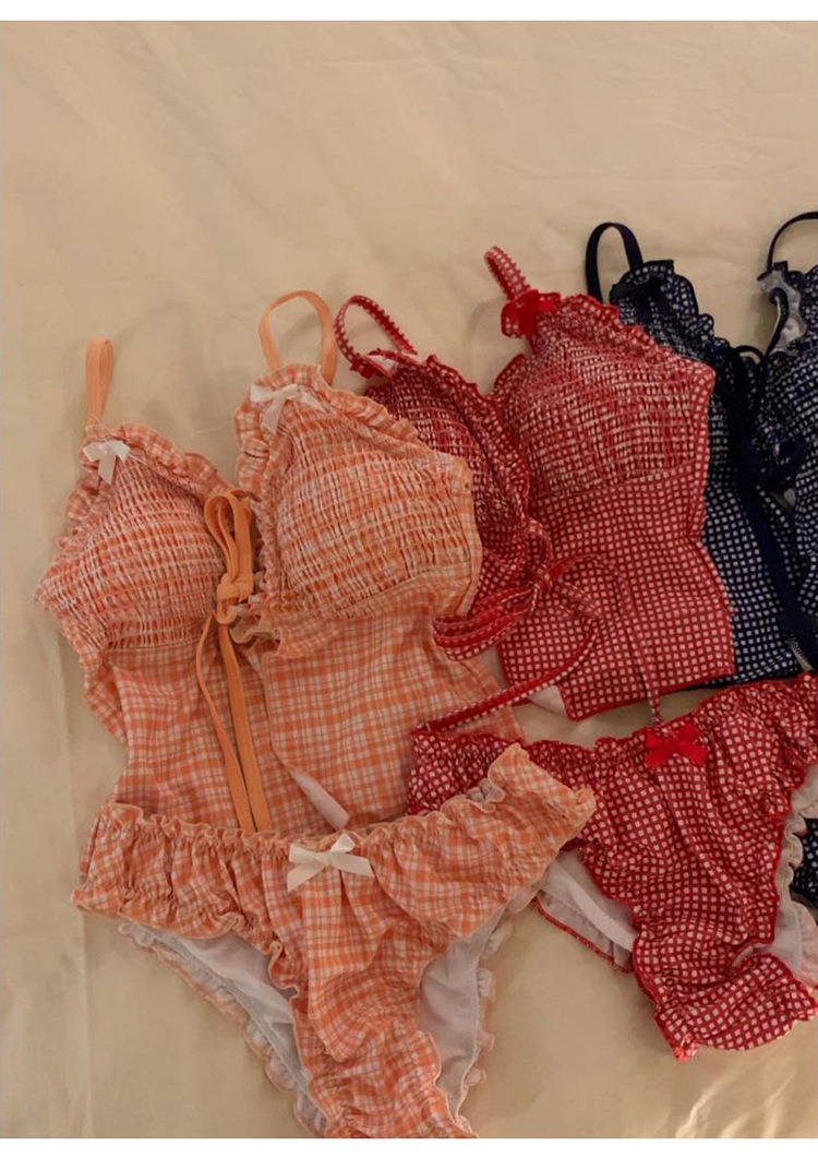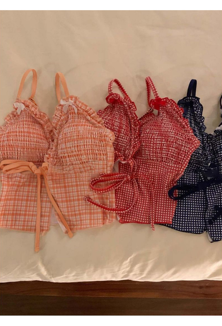 작은 가슴을 감싸주는 귀여운 일본식과 한국식 주름 장식과 리본으로 묶인 스플릿 비키니 수영복, 고급스러운 소녀 수영복