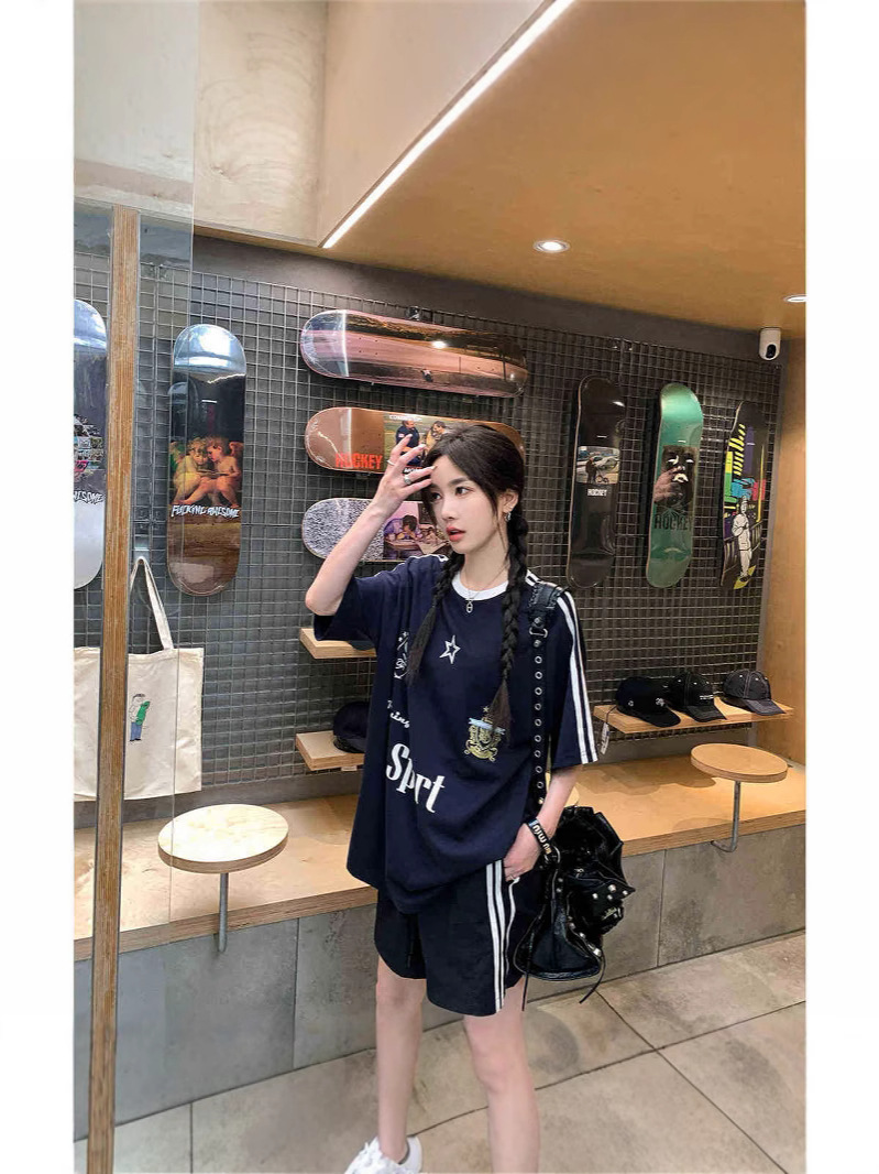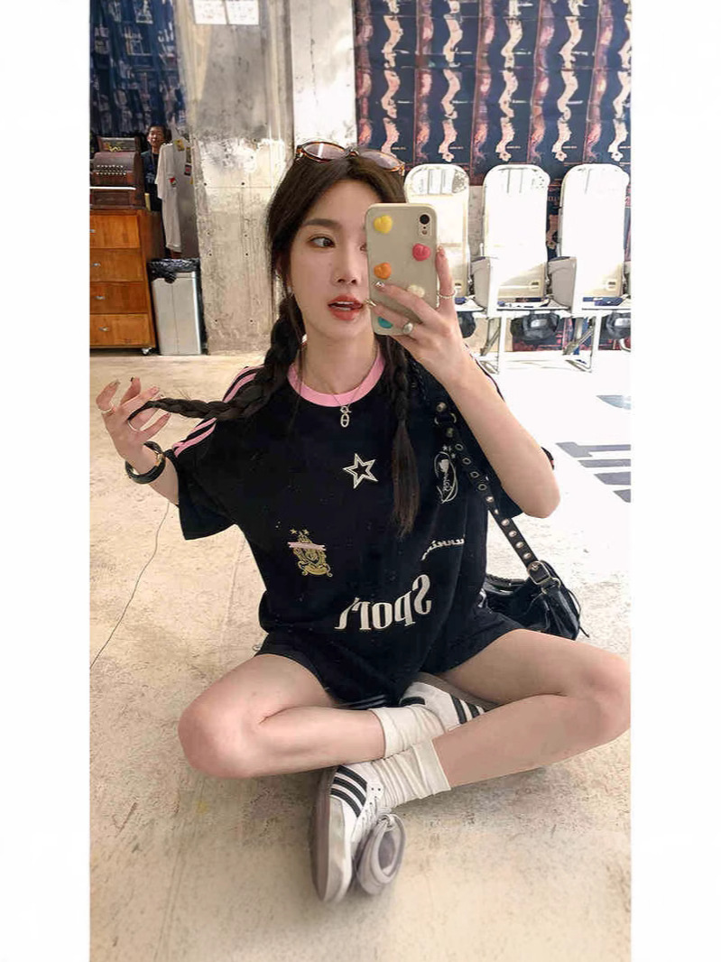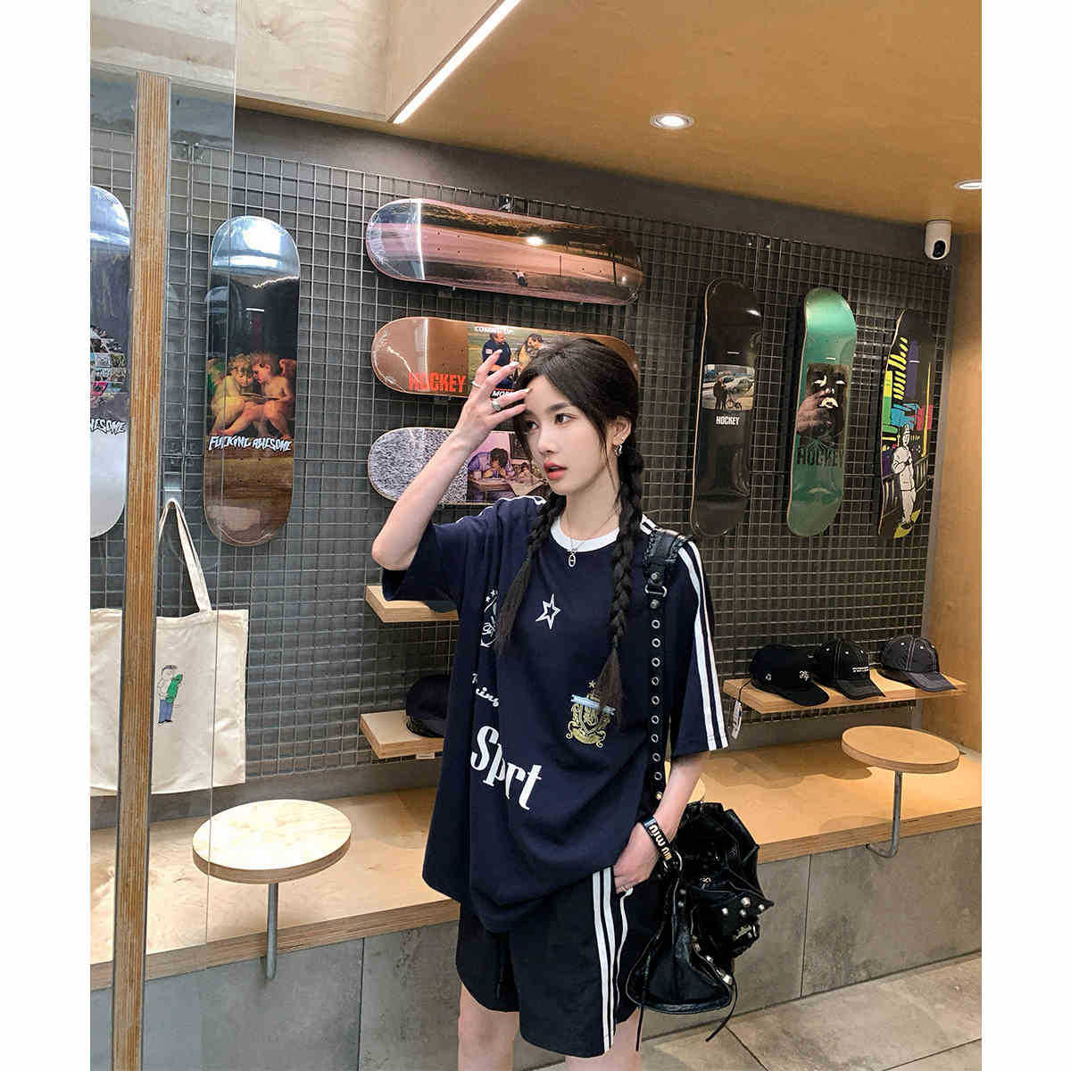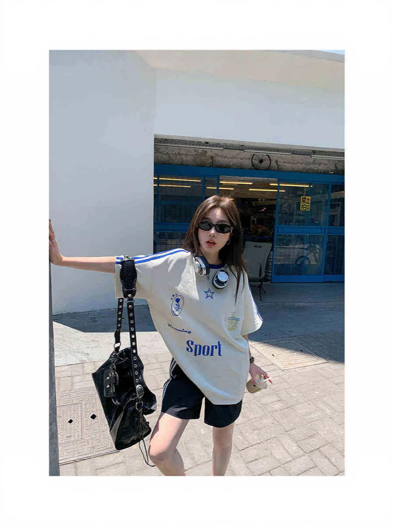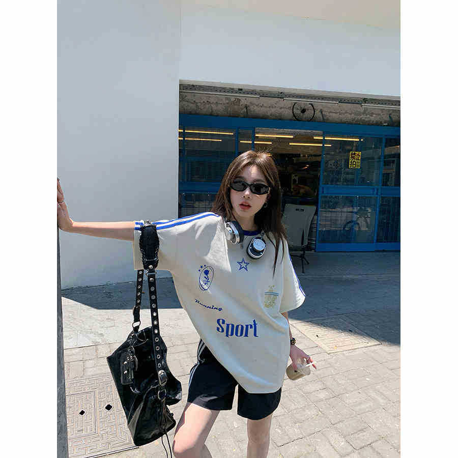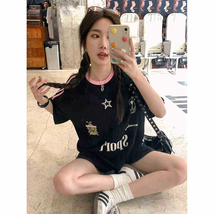 양면 면 아메리칸 레트로 레터 프린트 여름 신작 저지 여성용 루즈 캐주얼 반팔 티셔츠