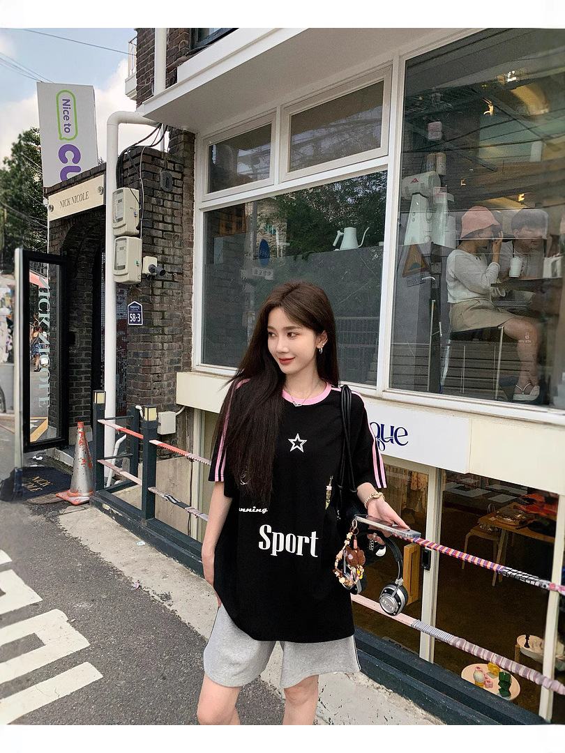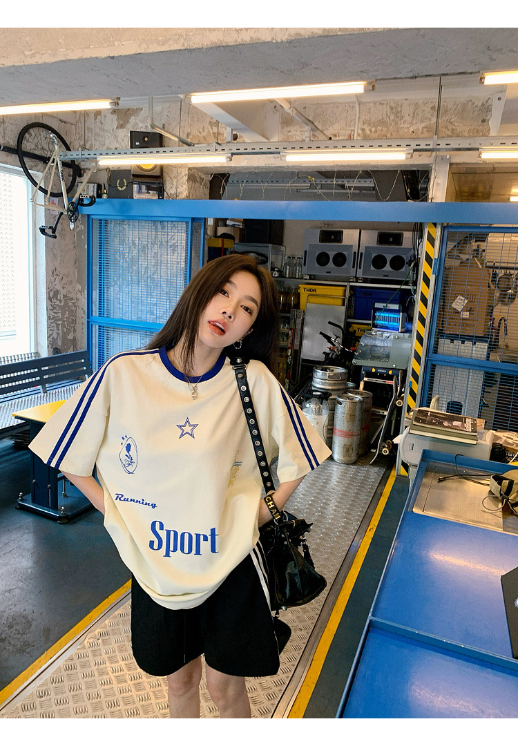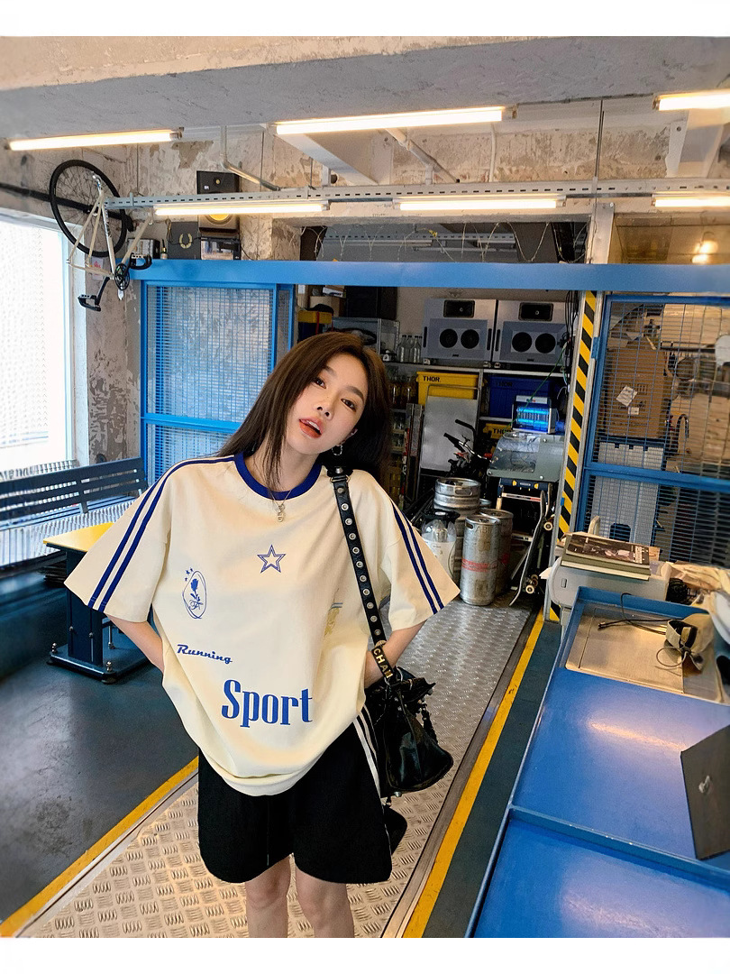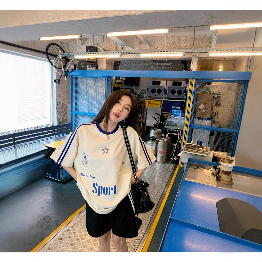 양면 면 아메리칸 레트로 레터 프린트 여름 신작 저지 여성용 루즈 캐주얼 반팔 티셔츠스토어 가기