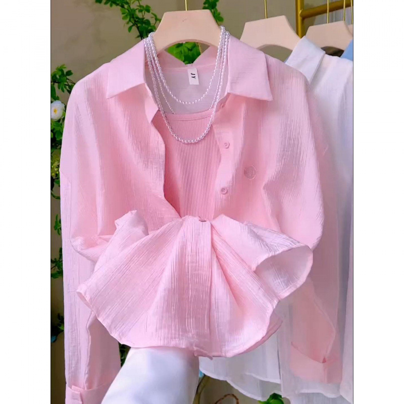 2025 여름 부드럽고 달콤한 핑크 플리츠 셔츠 탑 여성 루즈 캐주얼 폴로 칼라 얇은 자외선 차단 셔츠