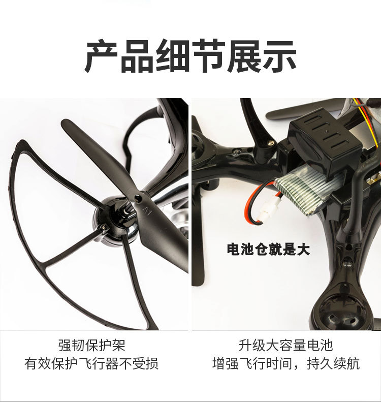 • 검정색 고정 높이 항공 사진 버전 4K 듀얼 카메라에는 VR 안경이 함께 제공됩니다.