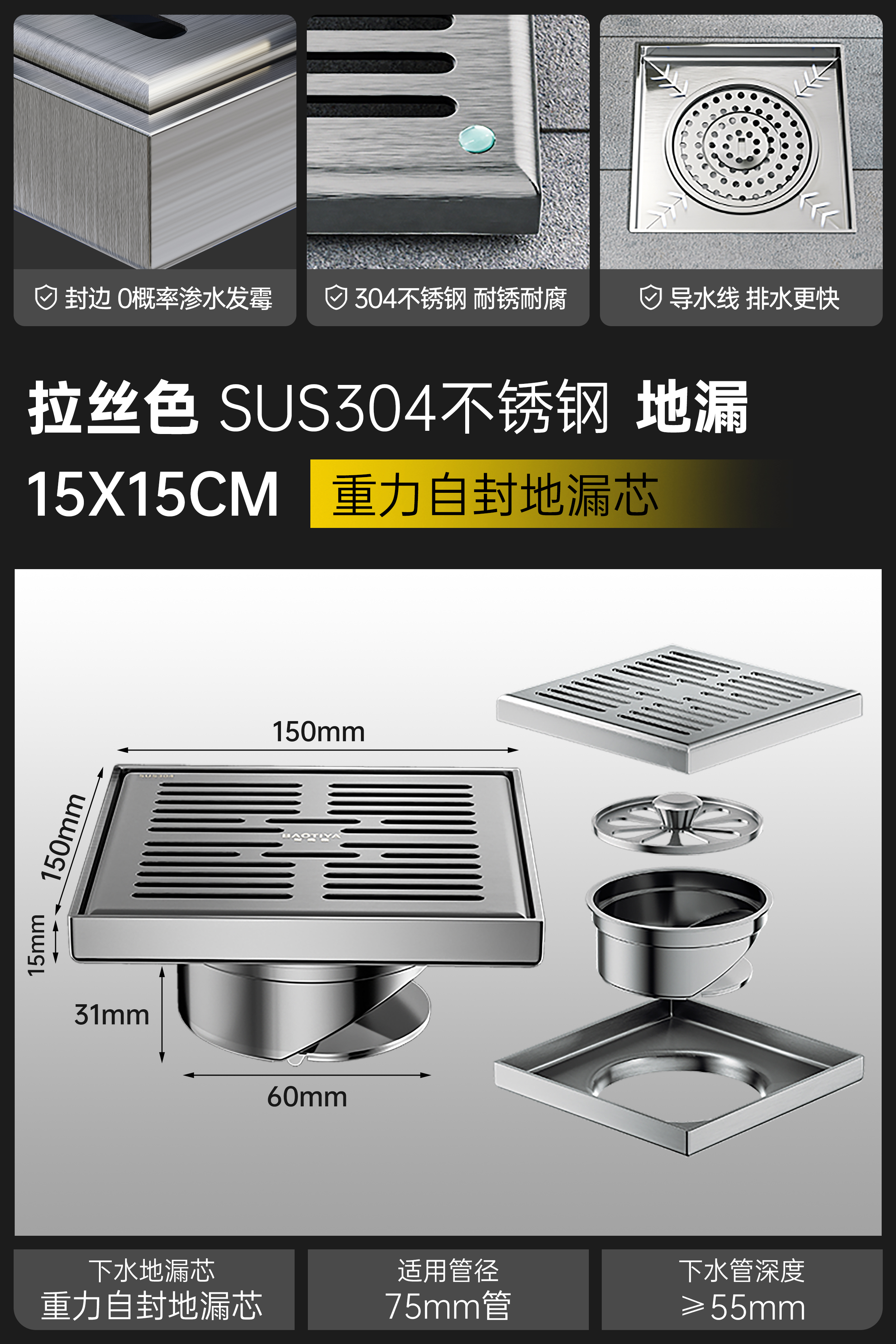 • ▲ ❀ ▼ ▼ ❀ ▲ 대용량 바닥 배수구 15*15 자체 밀봉 [75 튜브] 304 스테인레스 스틸 ▲ ❀ ▼ ▼ ❀ ▲