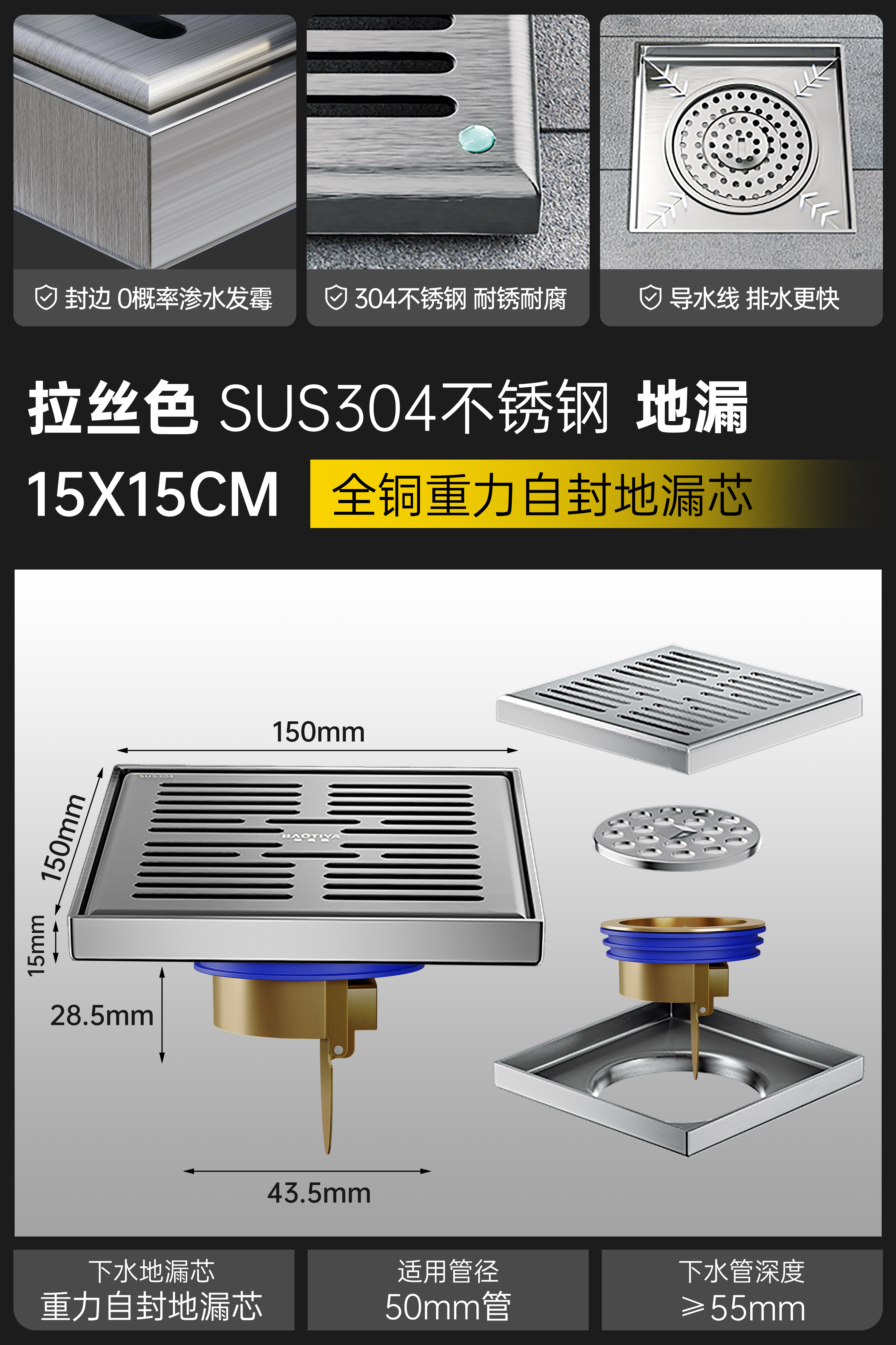 • ▲ ❀ ▼ ▼ ❀ ▲ 대용량 바닥 배수구 15*15 전체 구리 코어 자체 밀봉 [50 튜브] 304 스테인레스 스틸 ▲ ❀ ▼ ▼ ❀ ▲