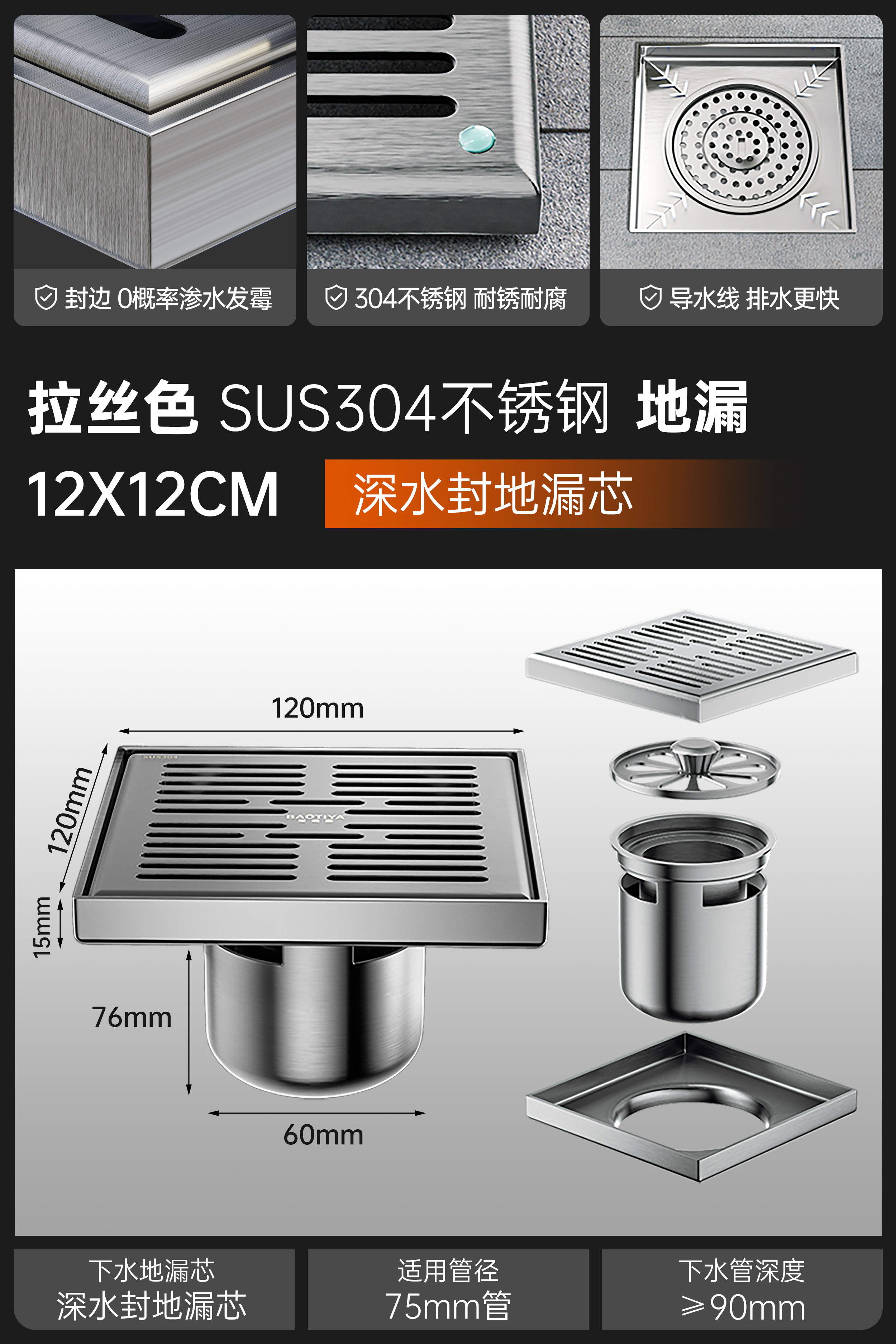 • ▲ ❀ ▼ ▼ ❀ ▲ 대용량 바닥 배수구 12*12 전체 구리 코어 자체 밀봉 [50 튜브] 304 스테인레스 스틸 ▲ ❀ ▼ ▼ ❀ ▲