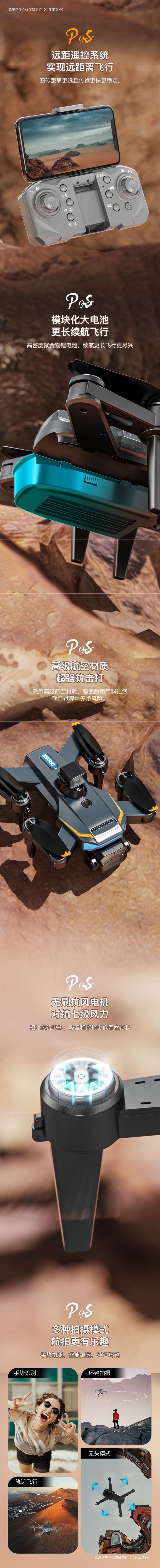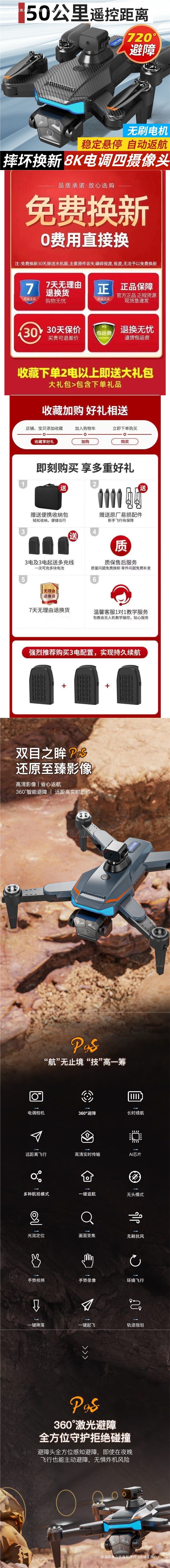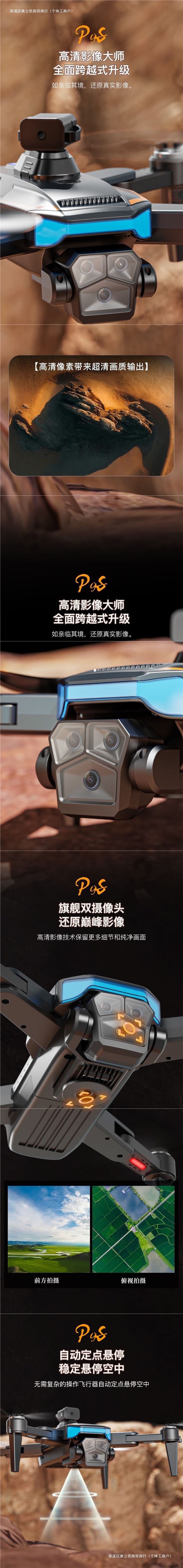 • 고마력 - 속도 증가 및 고정 높이 + 위치 지정 및 손실 방지 + 전자 제어식 3개 카메라 장애물 회피 및 복귀