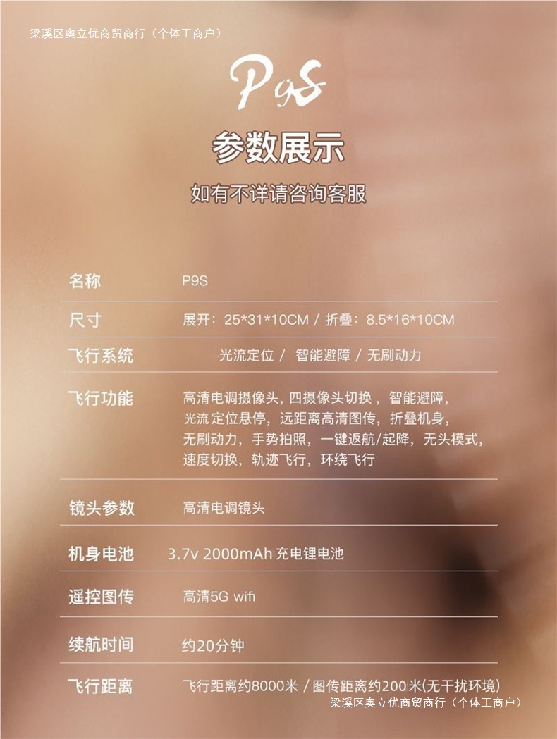 • 그라데이션 조명, 고출력 브러시리스 + 포지셔닝, 비행 스포트라이트, 3개 카메라, 배터리 부족 복귀