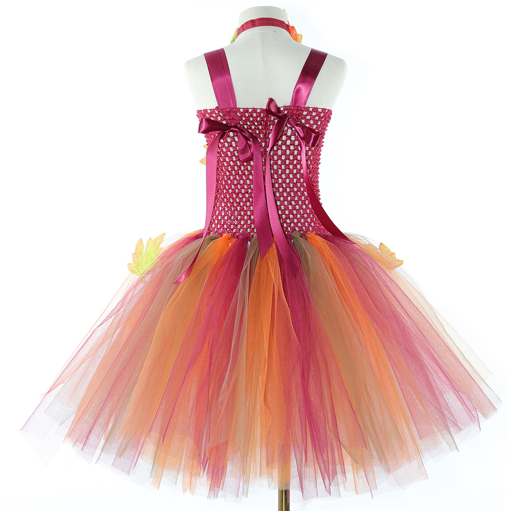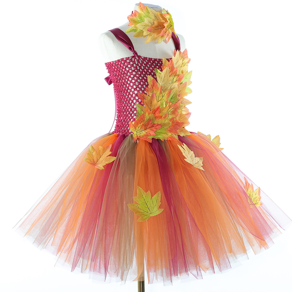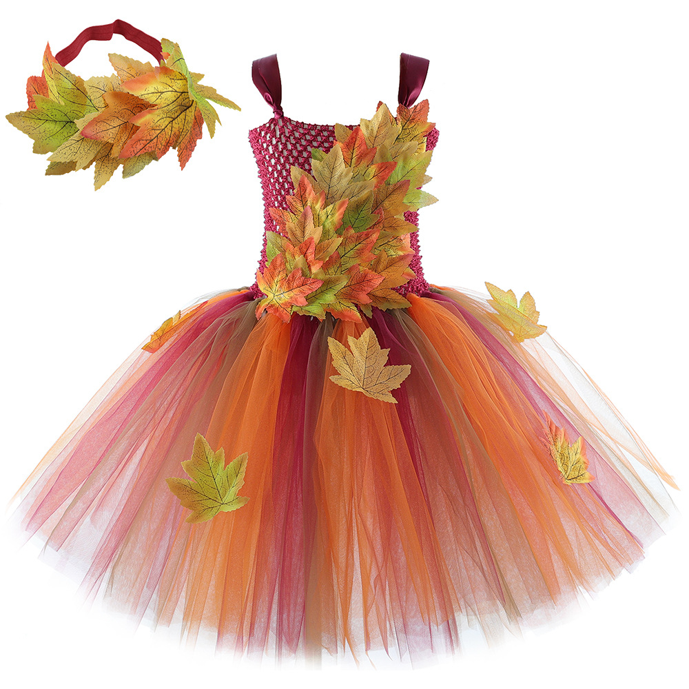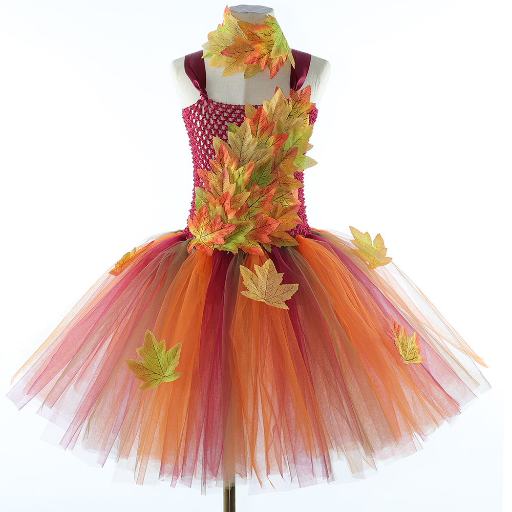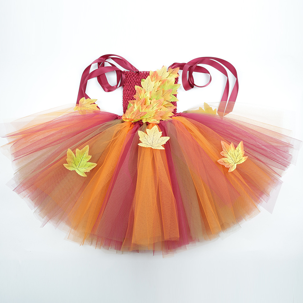 유럽과 미국의 인기 판매 시뮬레이션 단풍잎 어린이 메쉬 드레스 할로윈 추수 감사절 소녀 공주 투투 스커트스토어 가기