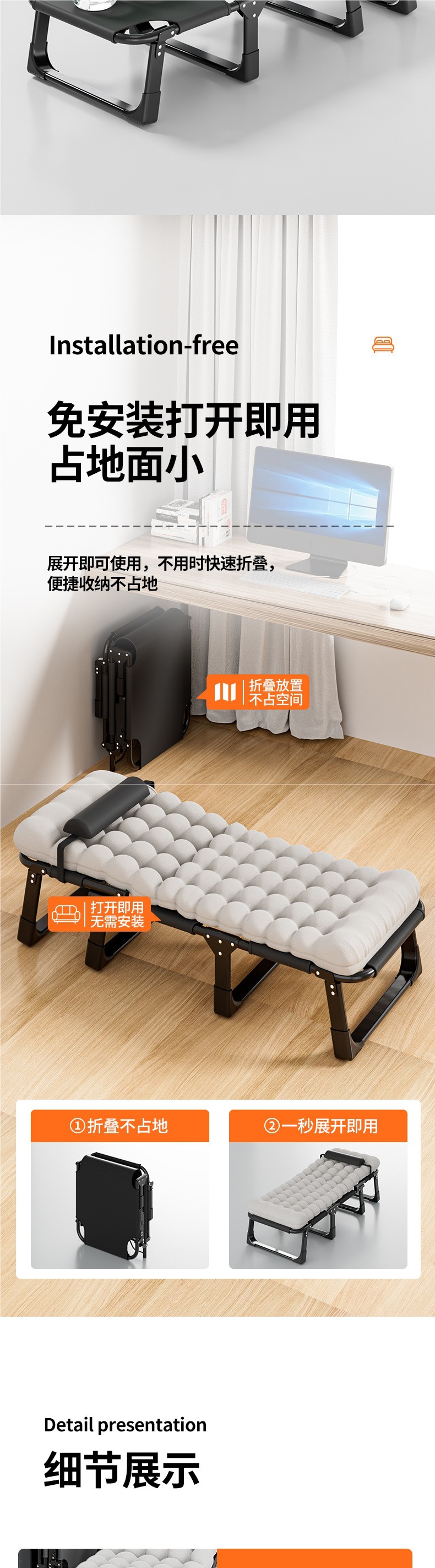 가벼운 접이식 침대, 싱글 침대, 가정용 성인 점심 시간 안락 의자, 사무실 침대, 캠프 동반자 침대, 휴대용 및 컴팩트스토어 가기