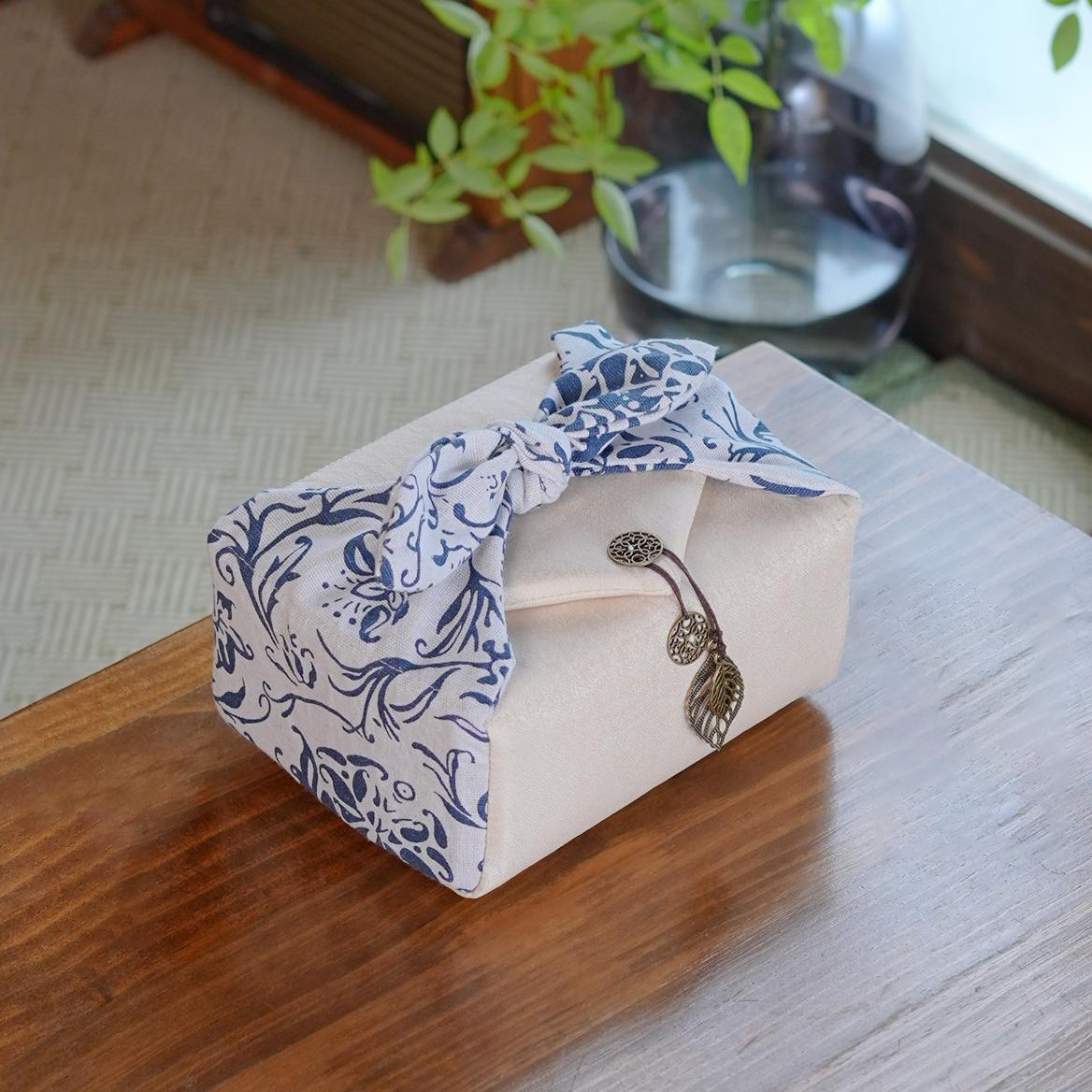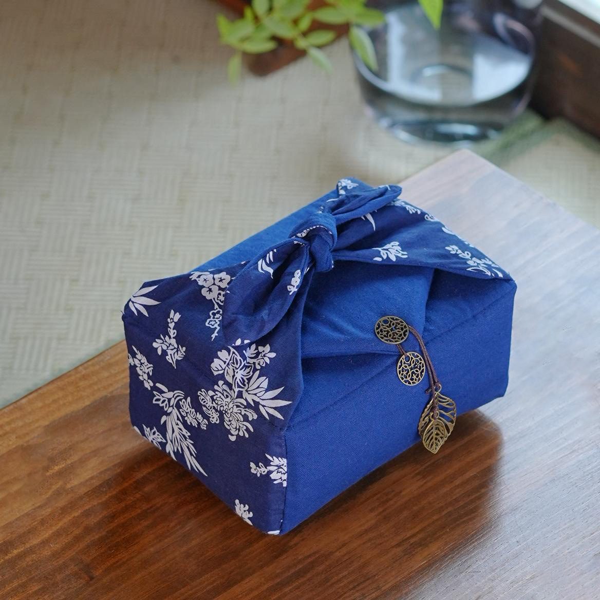 • 냄비 1개와 컵 3개, 파란색 꽃무늬 천