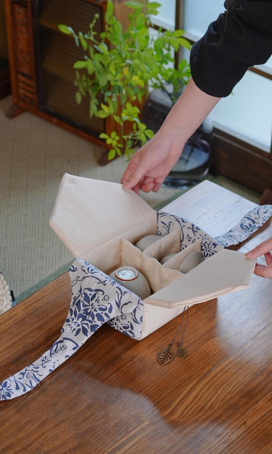 한 냄비, 두 또는 세 컵 차 세트, 여행용 휴대용 보관 가방, 중국 복고풍 스타일의 면 및 린넨 가방 보관 가방, 야외 여행