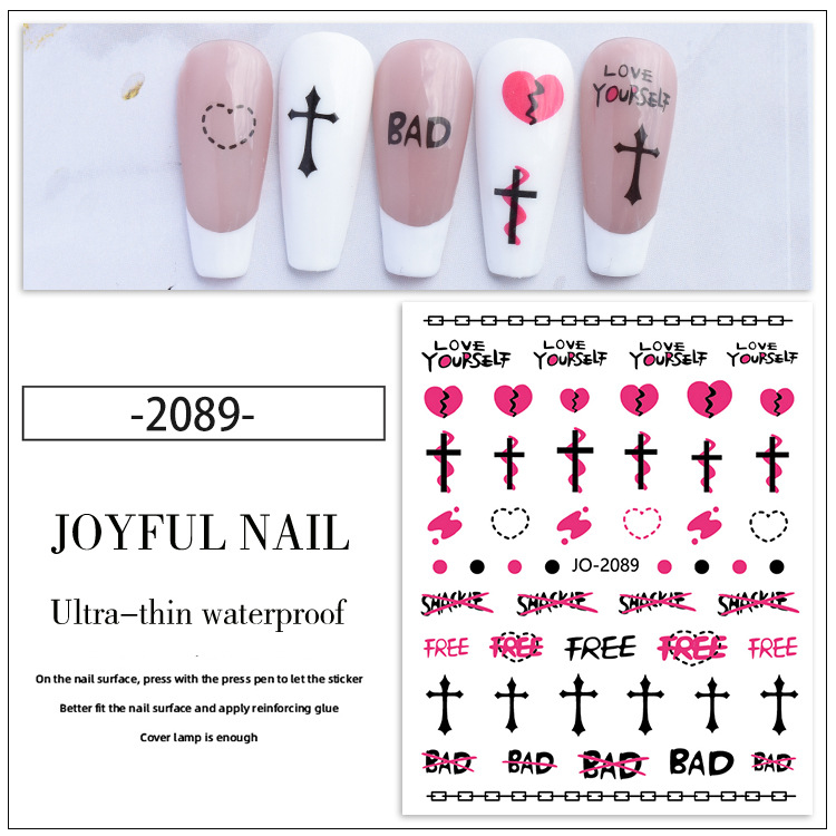 크로스 크로우 하트 네일 아트 스티커 영어 문자 낙서 스티커 ins 달콤한 멋진 흑백 빨간색 텍스트 네일 스티커스토어 가기