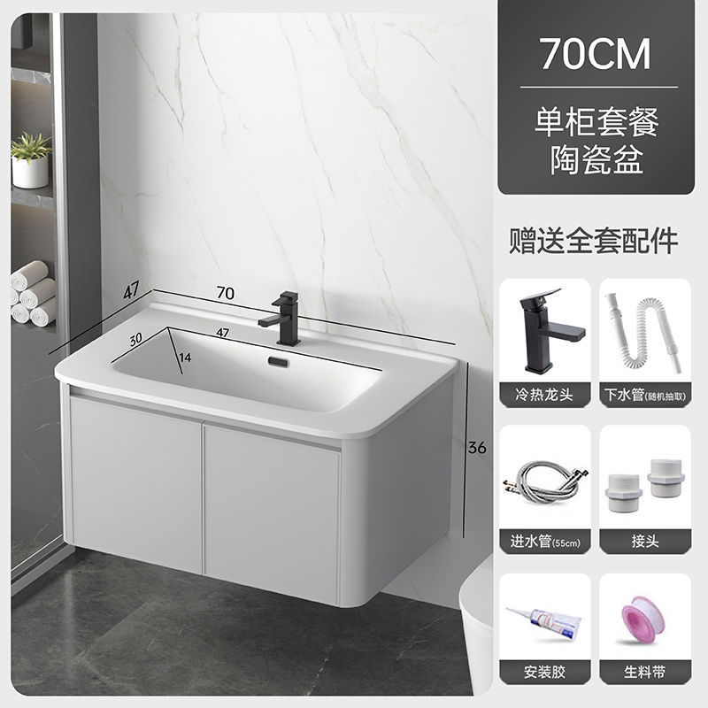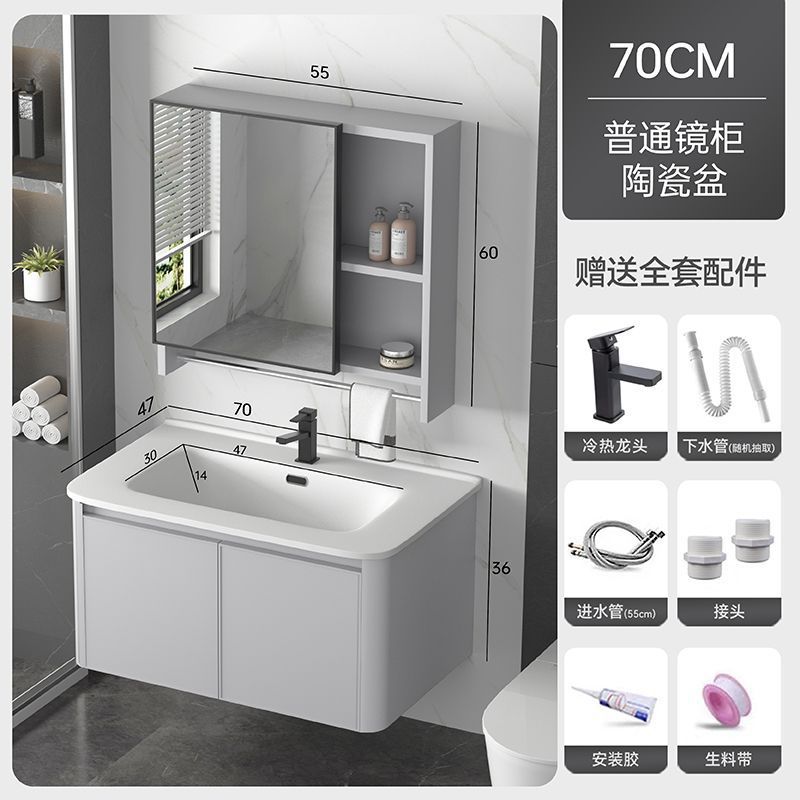 • 모서리가 둥근 메인 캐비닛 + 모서리가 둥근 세라믹 세면대 + 일반 거울 캐비닛_밝은 회색 모서리가 둥근 70CM