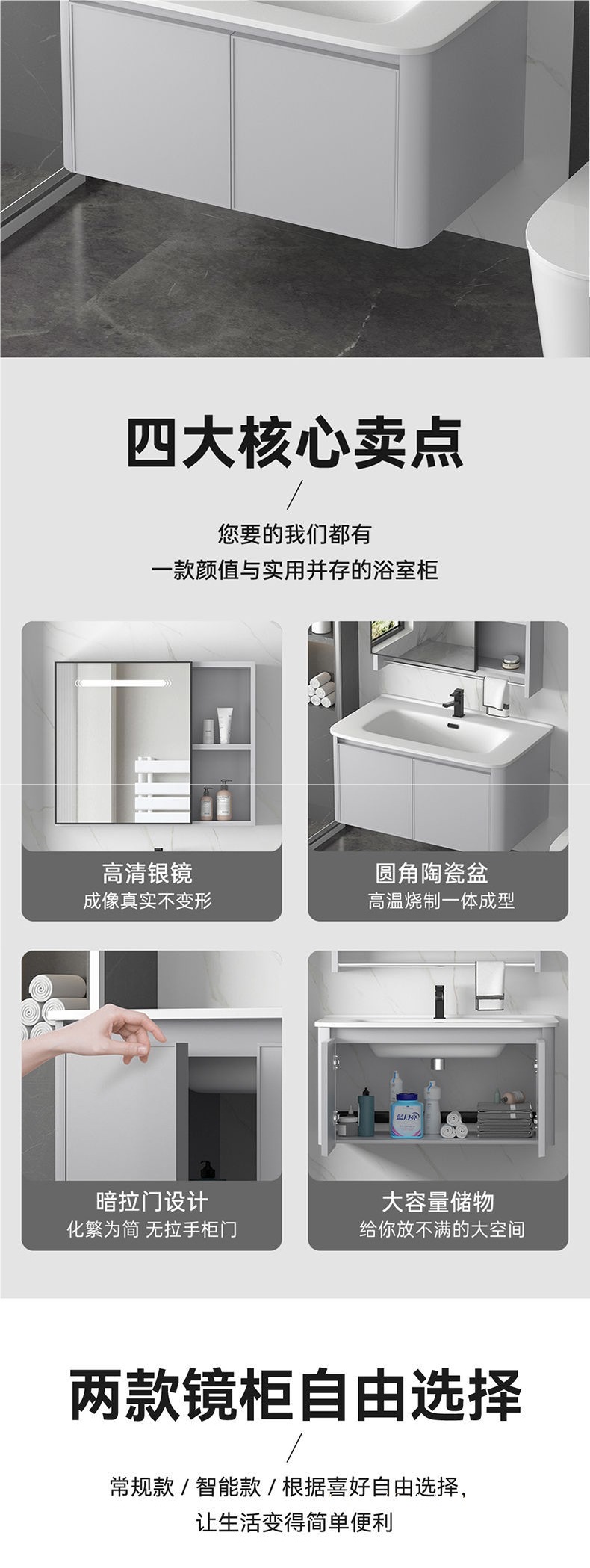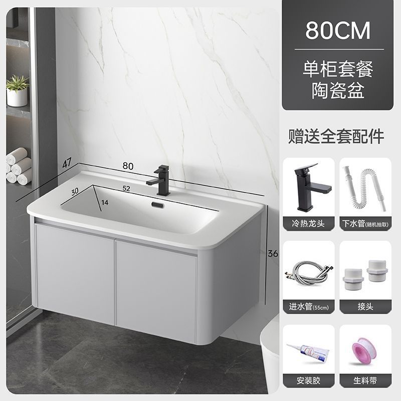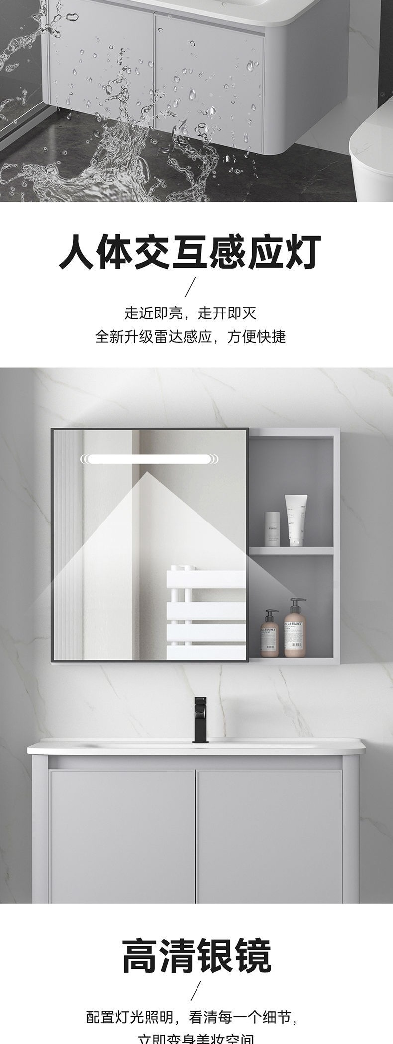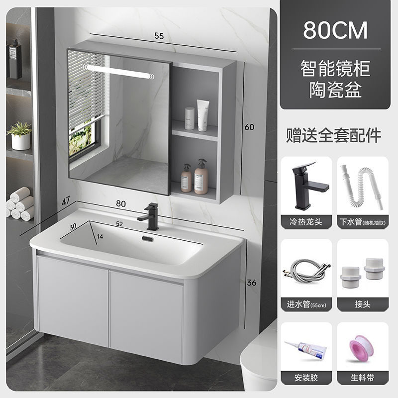 • 모서리가 둥근 메인 캐비닛 + 모서리가 둥근 세라믹 세면대 + 센서 조명 거울 캐비닛_라이트 그레이 둥근 모서리 80CM
