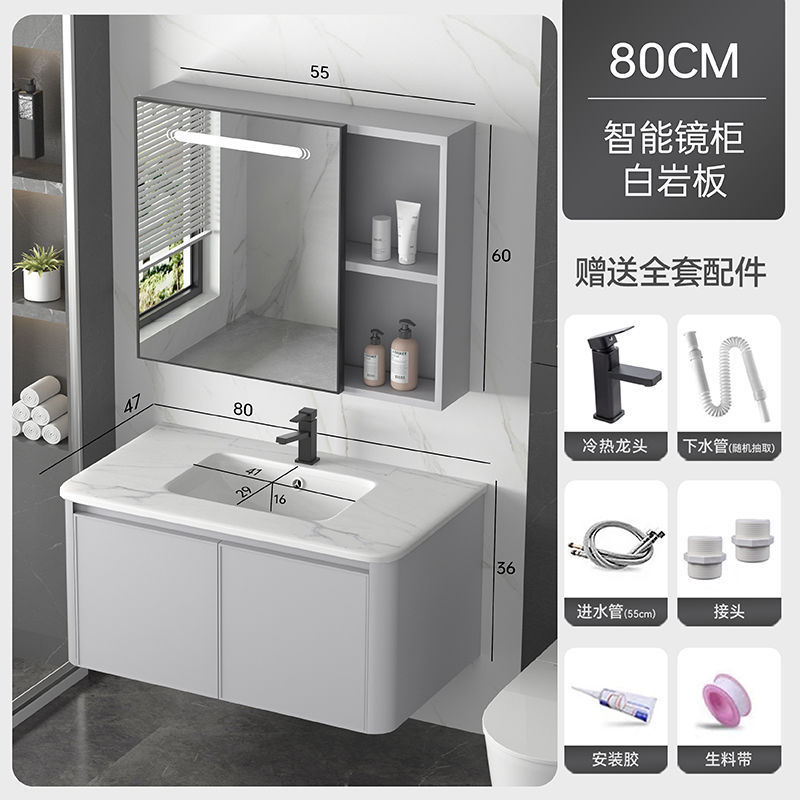 • 모서리가 둥근 메인 캐비닛 + 모서리가 둥근 슬레이트 세면대 + 센서 조명 거울 캐비닛_밝은 회색 모서리가 둥근 80CM