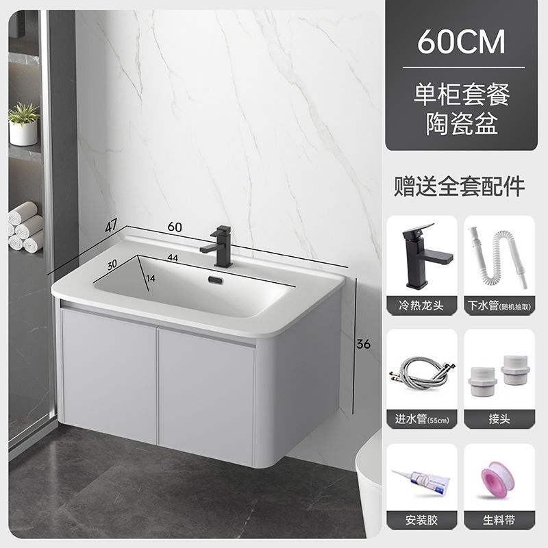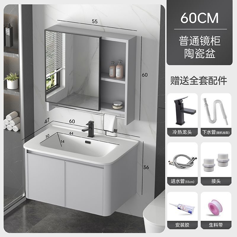 • 모서리가 둥근 메인 캐비닛 + 모서리가 둥근 세라믹 세면대 + 일반 거울 캐비닛_밝은 회색 모서리가 둥근 60CM
