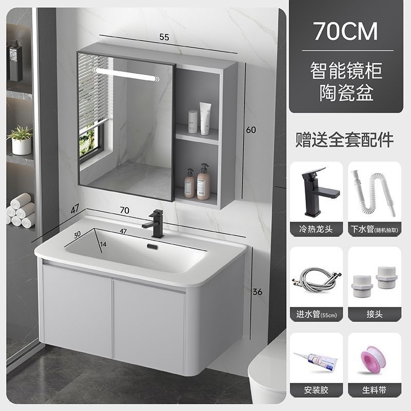 • 모서리가 둥근 메인 캐비닛 + 모서리가 둥근 세라믹 세면대 + 센서 조명 거울 캐비닛_밝은 회색 모서리가 둥근 70CM