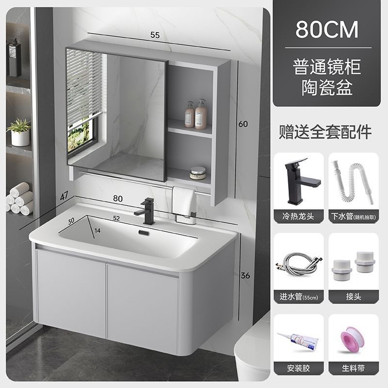 • 모서리가 둥근 메인 캐비닛 + 모서리가 둥근 세라믹 세면대 + 일반 거울 캐비닛_라이트 그레이 둥근 모서리 80CM