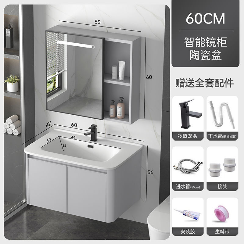 • 모서리가 둥근 메인 캐비닛 + 모서리가 둥근 세라믹 세면대 + 센서 조명 거울 캐비닛_라이트 그레이 둥근 모서리 60CM