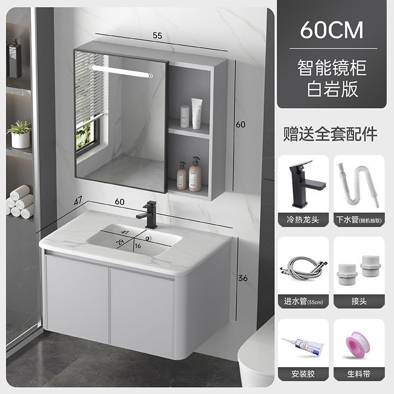 • 모서리가 둥근 메인 캐비닛 + 모서리가 둥근 슬레이트 세면대 + 센서 조명 거울 캐비닛_밝은 회색 모서리가 둥근 60CM