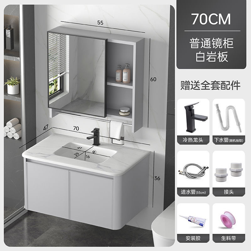 • 모서리가 둥근 메인 캐비닛 + 모서리가 둥근 슬레이트 세면대 + 일반 거울 캐비닛_밝은 회색 모서리가 둥근 70CM