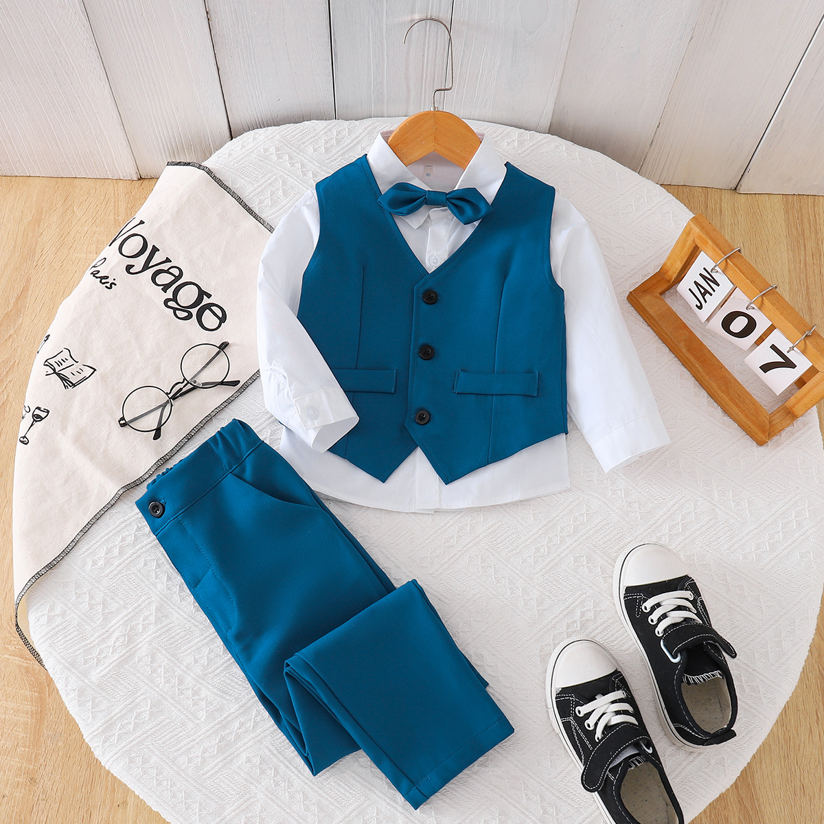 봄과 가을 소년 흰색 긴팔 셔츠 파란색 조끼 바지 나비 넥타이 신사 우아한 드레스 정장 결혼식스토어 가기